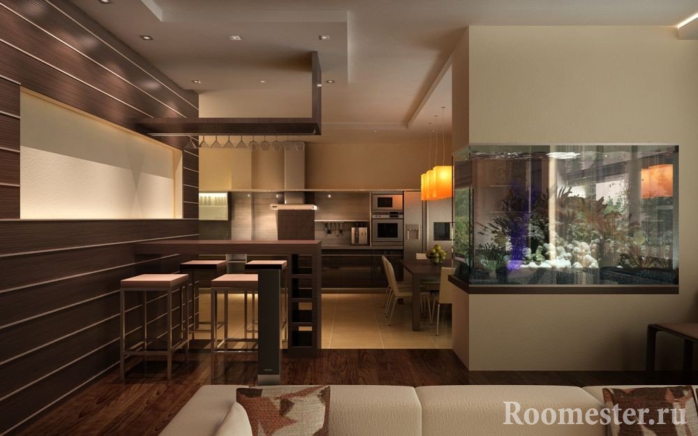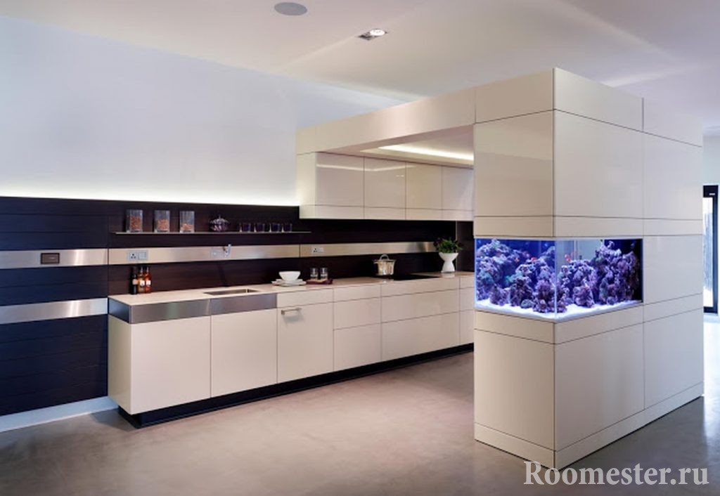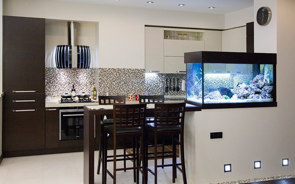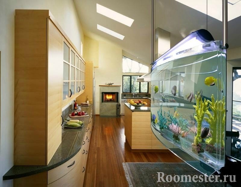 La apariencia del acuario depende del tamaño de la cocina.Una habitación grande contendrá un tanque, que no será parte del espacio, sino el espacio en sí. Con él, puede separar las áreas funcionales y de comedor. Si se coloca dentro de las fachadas de muebles o paredes, entonces las dimensiones deberían ser más modestas.