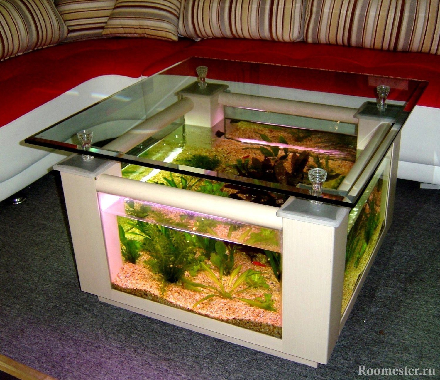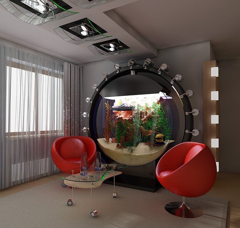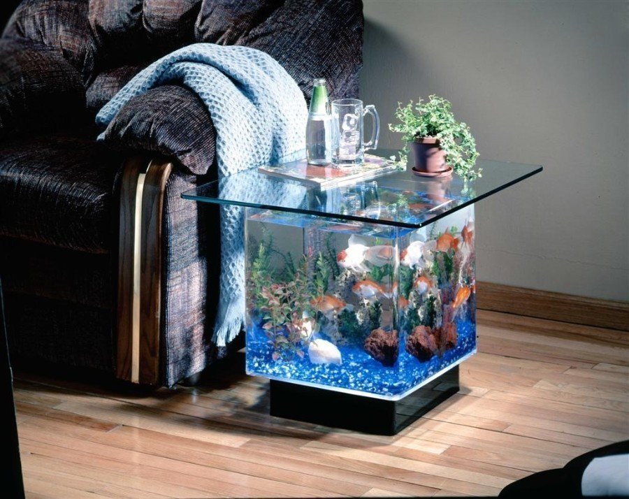 Una mesa de café-acuario en la sala de estar no ocupa mucho espacio, ayuda a relajarse después de un día duro. Los reposabrazos del sofá, donde se construyen tanques con algas y peces carroñeros, serán igual de originales.