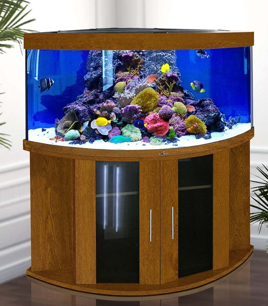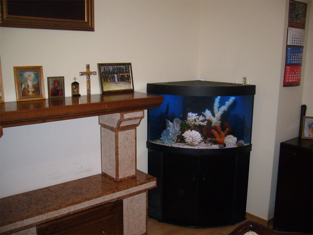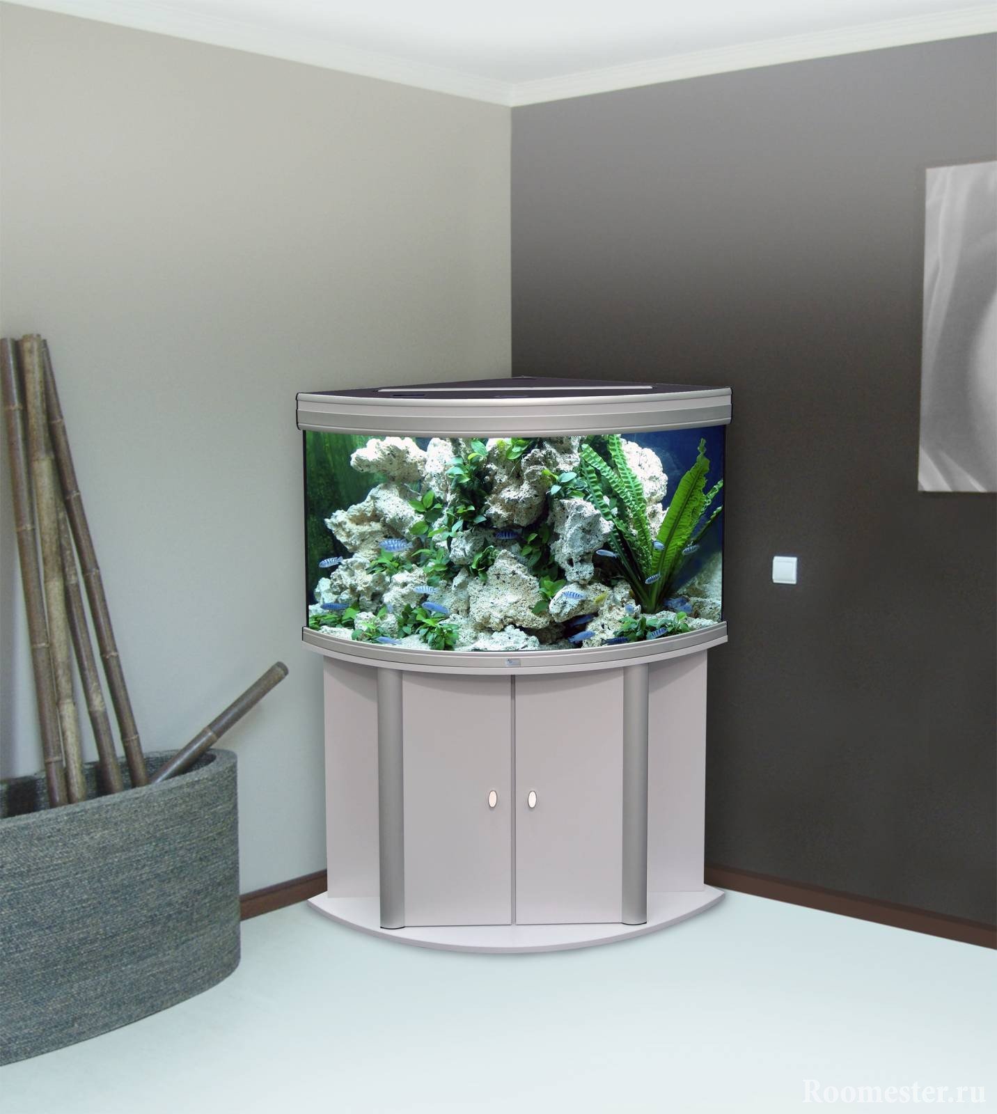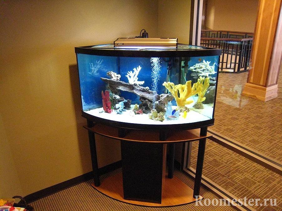 Se coloca un pequeño acuario de esquina sobre una mesa o soporte. Es más adecuado para pequeños peces de flocado. Si el acuario es capaz de acomodar hasta 500 litros, entonces las personas más grandes pueden vivir allí sin problemas, se instala en una base poderosa. El gabinete debe integrarse con el resto de los muebles. Los acuarios de 500-700 litros requieren mucho espacio, deben ser bien visibles.
