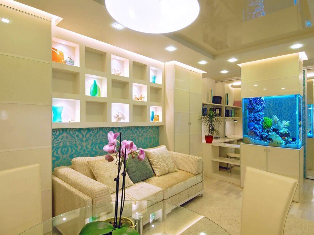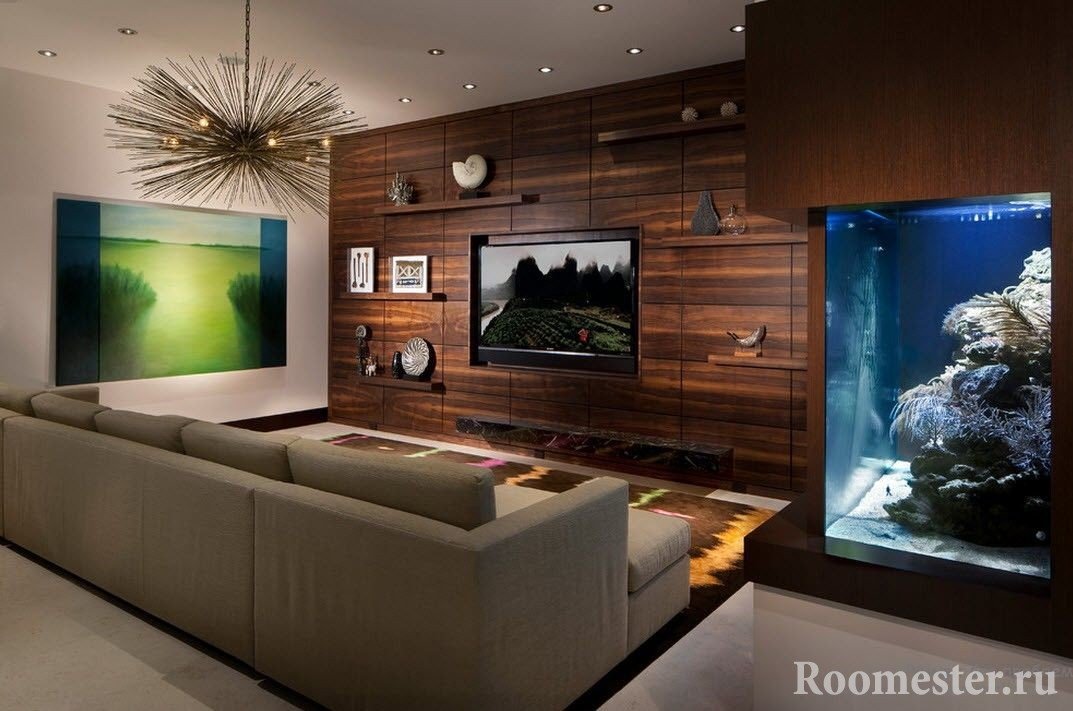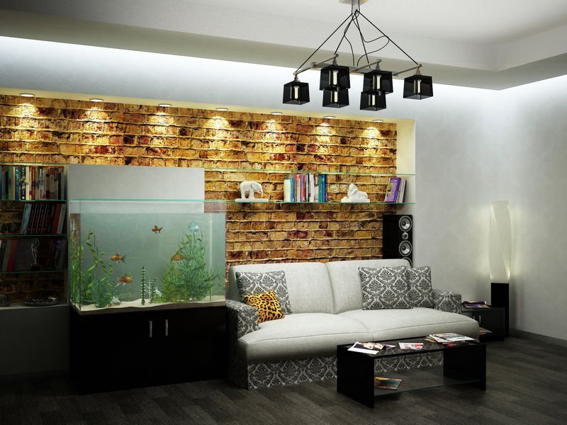 El interior de la sala de estar con una pared o un acuario colgante será una opción universal, especialmente si la habitación no difiere en grandes dimensiones.