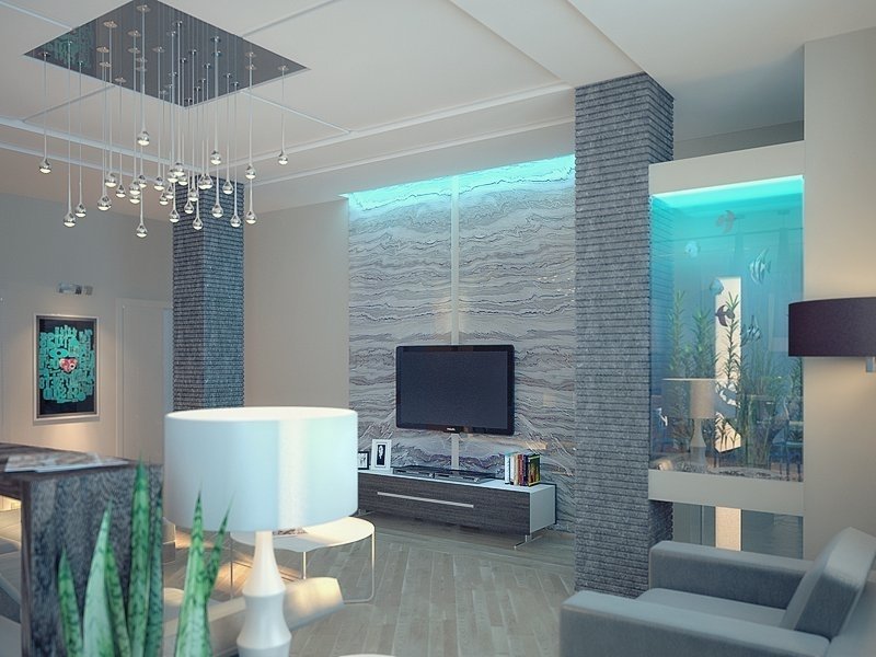 En la sala de estar, este objeto actuará como un centro de atención universal. Aquí se convertirá en un elemento independiente del interior o servirá como un separador de zona.Esta sala es ideal para instalar el acuario idealmente, donde se convertirá en la parte dominante. Solo es necesario tener en cuenta el tamaño de la habitación.