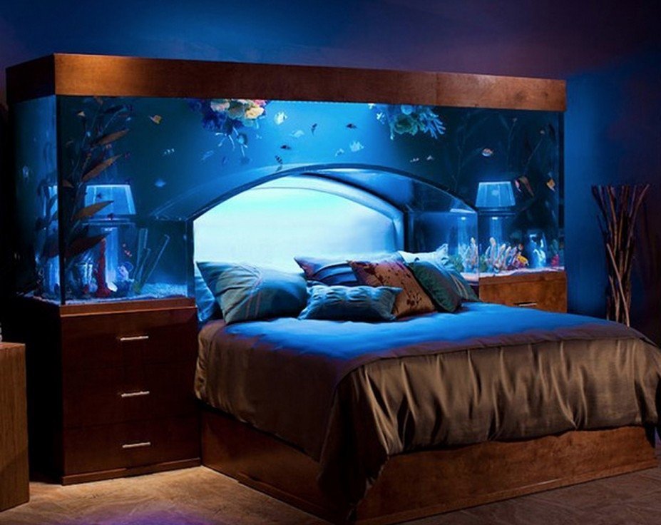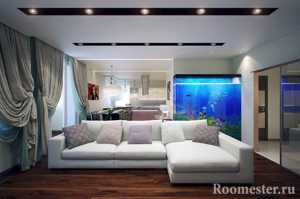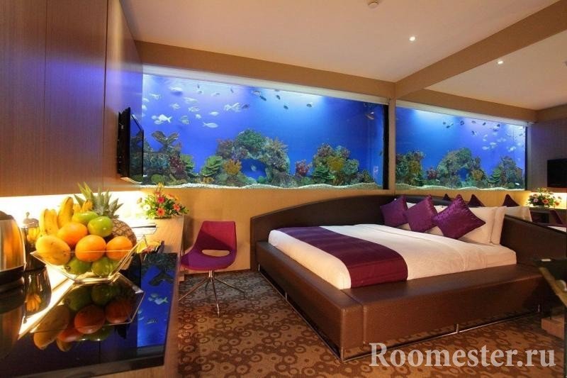 Si la habitación es espaciosa y requiere zonificación, es adecuado un acuario de partición, que separará la cama de las áreas de trabajo y de juego.