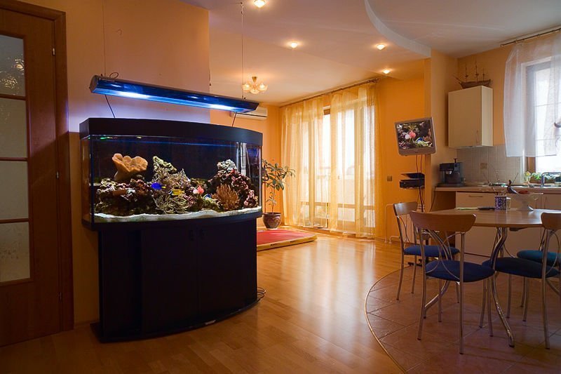 En la sala de estar, los acuarios están montados en la pared, a ambos lados del televisor. De vez en cuando, distraído de la acción dinámica en la pantalla, puede relajarse mientras mira el mundo submarino. El acuario se organiza desde el televisor, sacando el relleno de la caja usada e insertando un matraz con habitantes del mar correspondiente al tamaño. Una especie de "video" para el resto de la casa y los invitados.