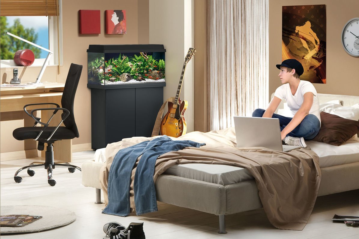 El centro eléctrico permite regular o apagar completamente la calefacción con el efecto visual de la combustión. Cerca de este "complejo de relajación", será cómodo relajarse en cualquier época del año y observar a los guppies, cíclidos y camarones.