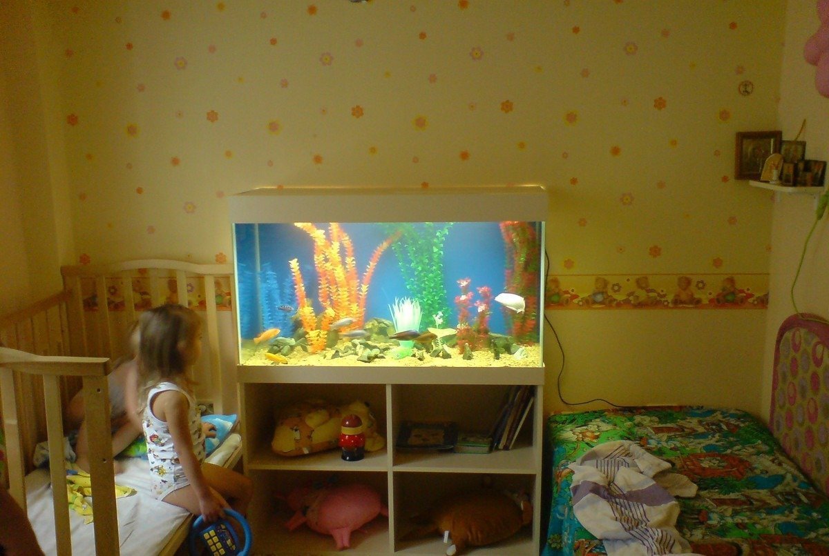 Antes de instalar la solución interior original, debe asegurarse de que el niño no sea alérgico a los alimentos para peces, que el recipiente en el que va a vivir sea seguro. Al planificar la disposición de la habitación, puede organizar un consejo familiar, donde el niño también participará. Para mayor claridad, los cambios interiores planificados se le pueden presentar en la foto.