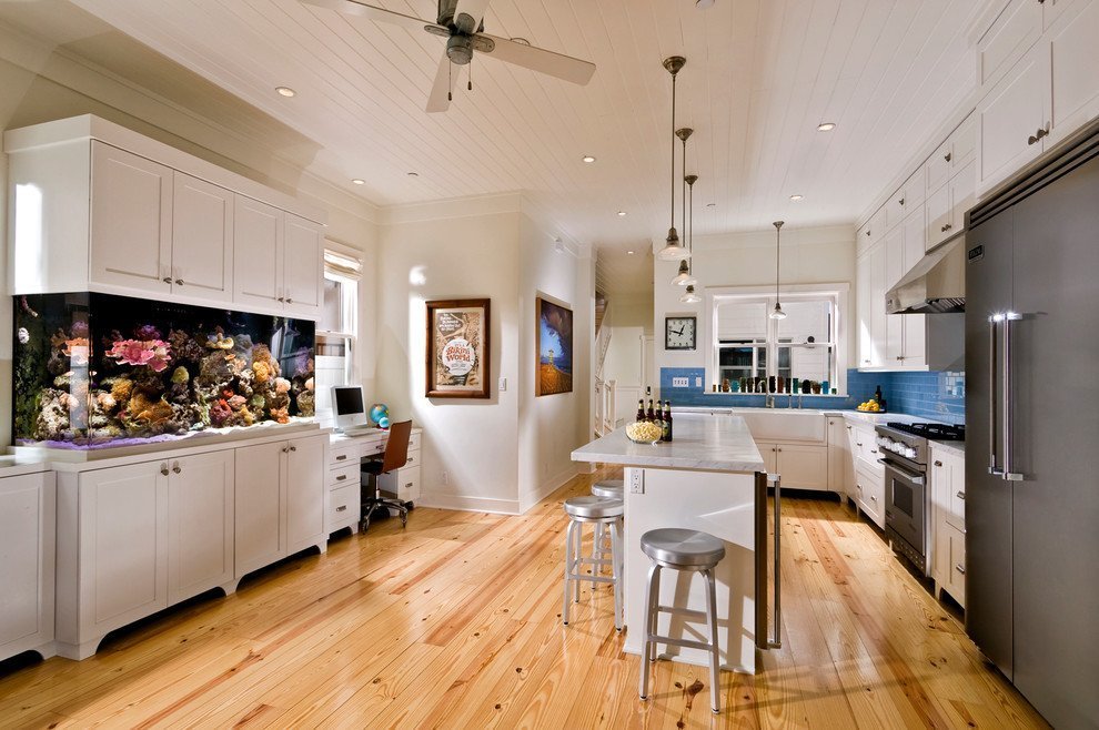 Colocar un acuario en la cocina es conveniente porque Es fácil organizar un sistema de suministro y salida de agua, habrá muchos menos problemas con la limpieza del tanque. Solo es necesario pensar de antemano en un sistema de comunicación, seguridad del suministro actual, ventilación de muebles. Para el agua que ingresa al tanque, es mejor instalar un tratamiento de niveles múltiples, ya que El aire de la cocina está más contaminado.