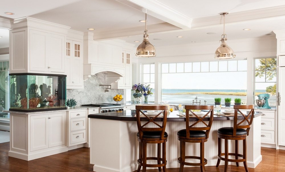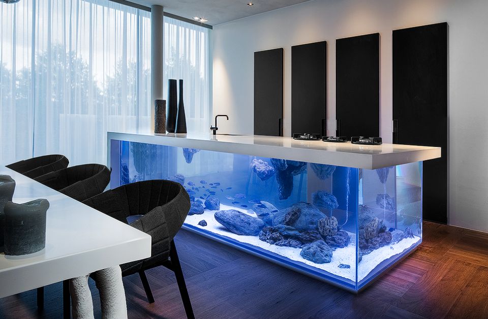 Las cocinas modernas equipadas con tecnologías y funciones a menudo se convierten en la sala donde los hogares pasan mucho tiempo. Los acuarios también se convierten en parte del interior de esta sala, a la que agregan movilidad y luz. Por lo tanto, hay marcas de muebles cuyos catálogos son acuarios incorporados.