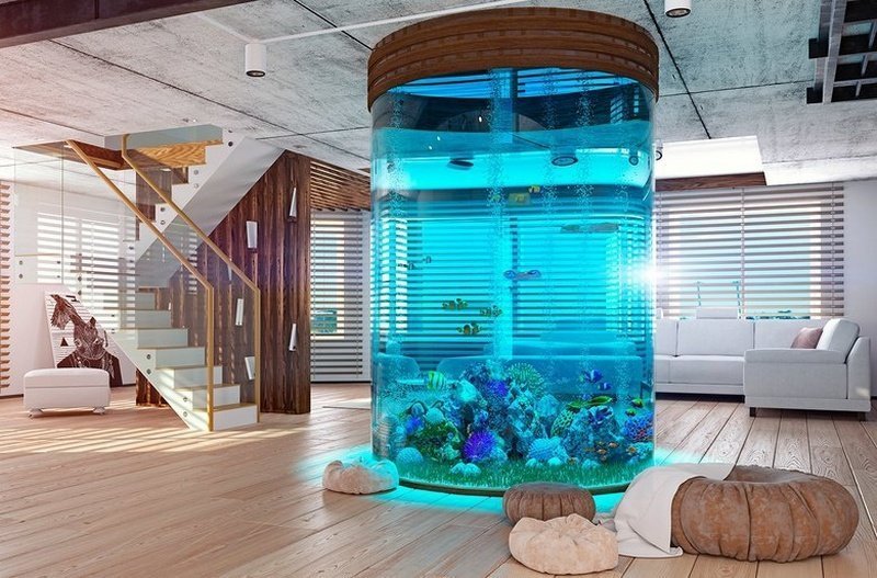 Gracias a una partición transparente, la parte opuesta de la habitación será visible. Una pieza de la naturaleza real se introduce en el interior donde se encuentra un acuario similar. Con su ayuda, separan la cocina del pasillo o la sala de estar, reviven los colores desteñidos e incluso los reemplazan con una obra de arte.