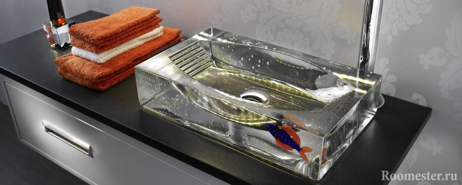 El fregadero puede no ser de cerámica, sino de vidrio duradero. Las algas y los peces reales vivirán en un recipiente debajo de una cubierta superior gruesa.
