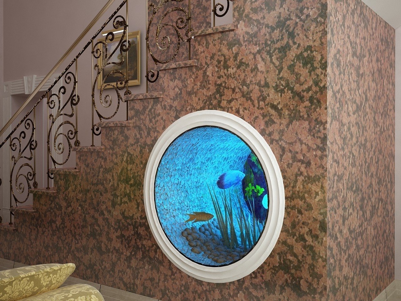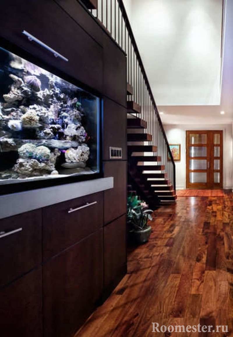 El espacio debajo de las escaleras a menudo no sabe cómo usarlo. Una buena solución sería organizar un acuario con habitantes vivos y coloridos.