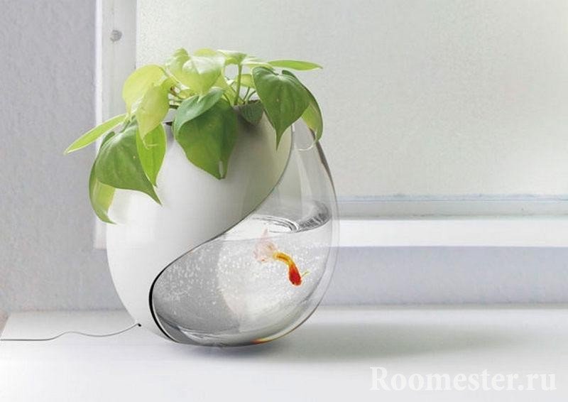 Para los amantes de la vida salvaje y las formas minimalistas, puede ofrecer combinar un acuario con una maceta. En tal casa vivirán flores y peces de interior. La base de una lámpara de mesa, incluso una taza del inodoro, se transforma fácilmente en un acuario.