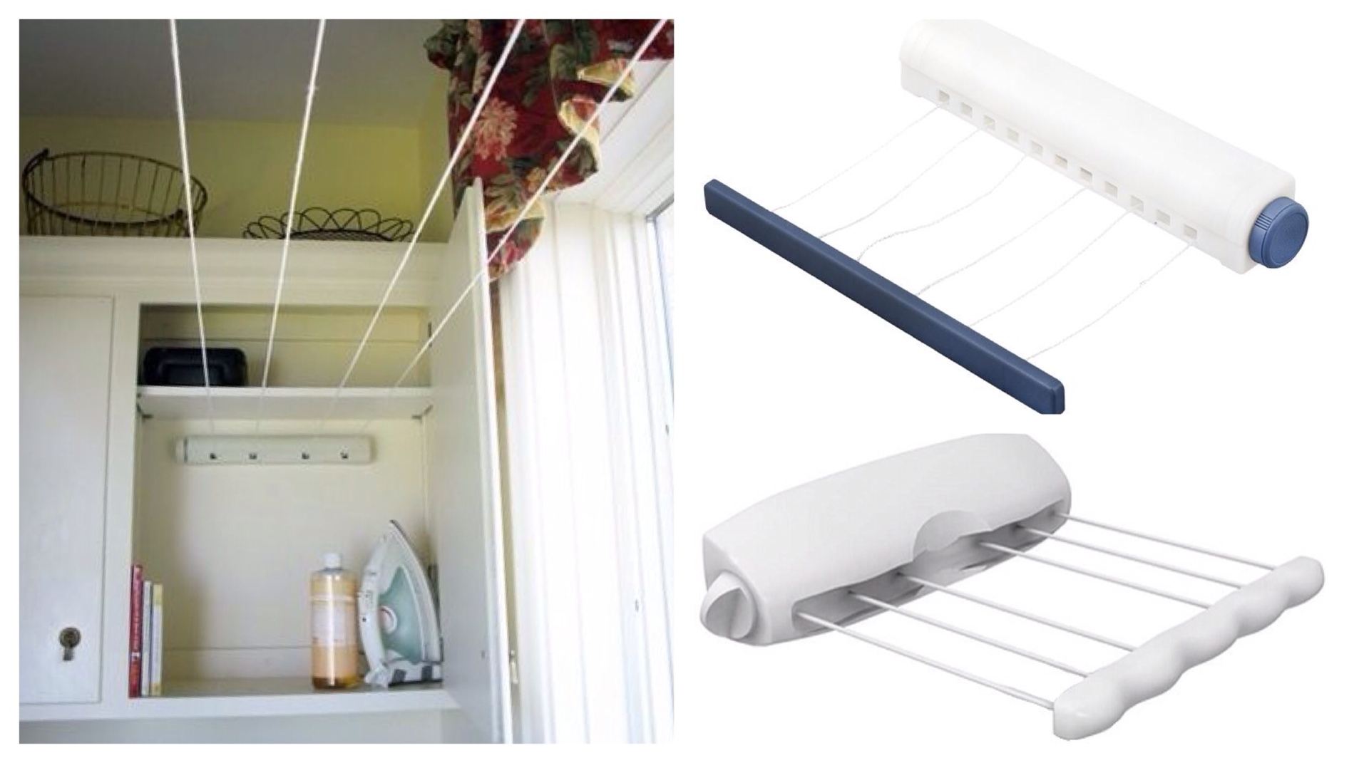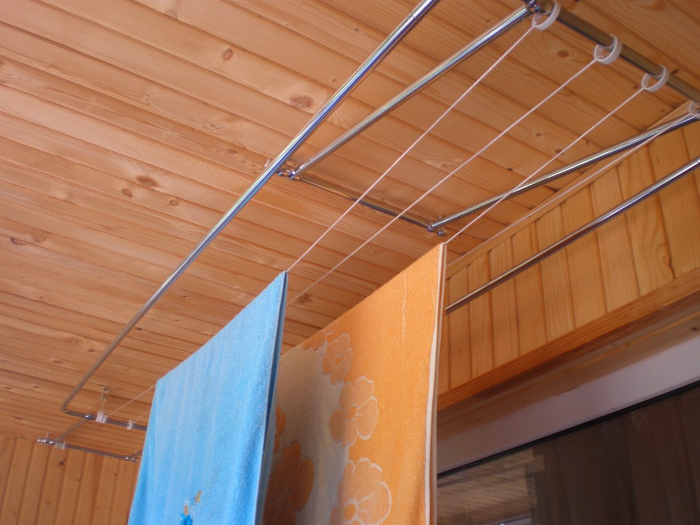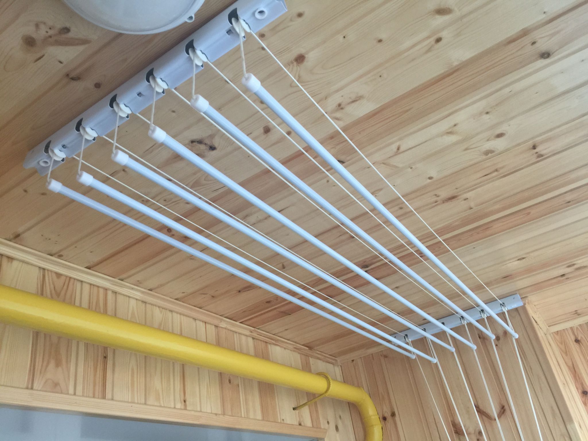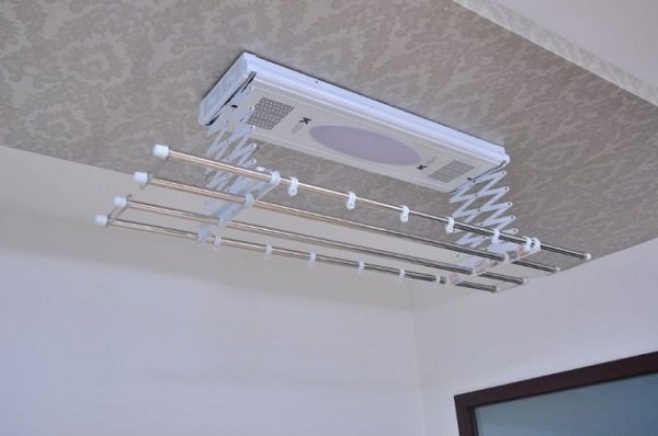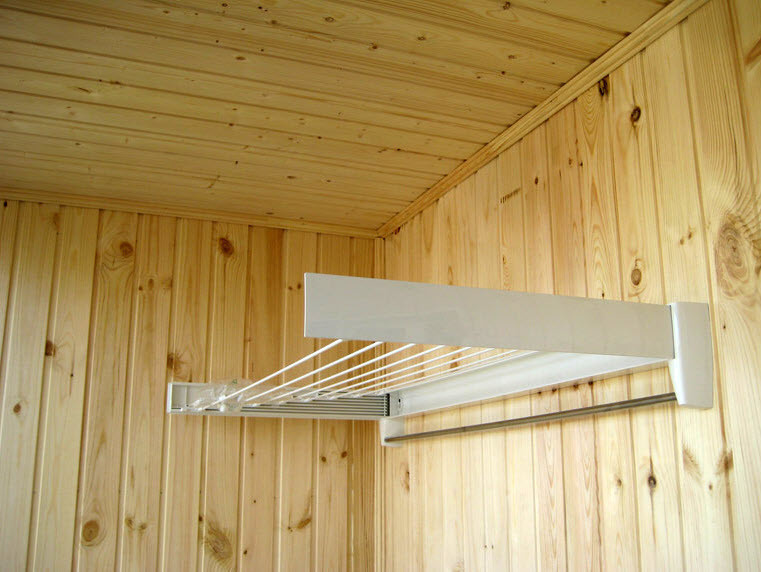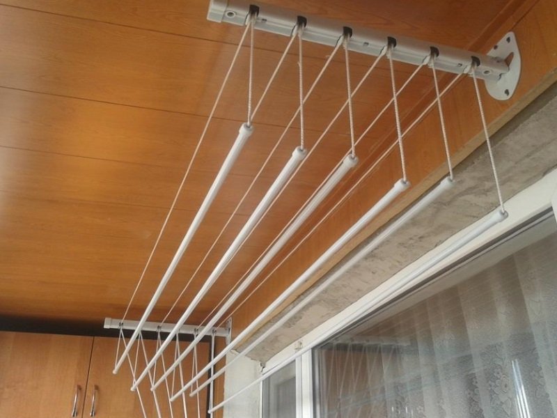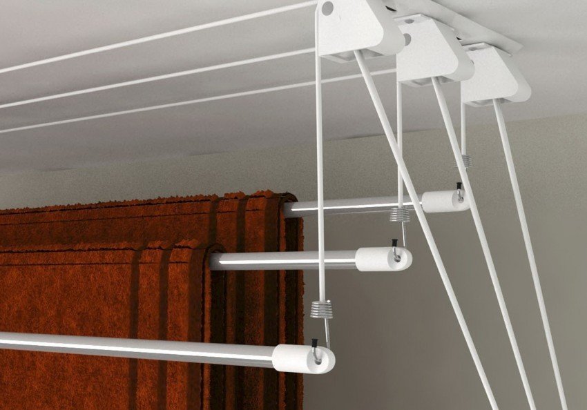 suspendido: los modelos estacionarios, entre los lados de metal de los cuales se tira el tendedero, ocupan espacio libre debajo del techo.