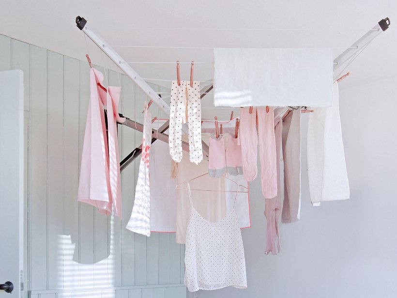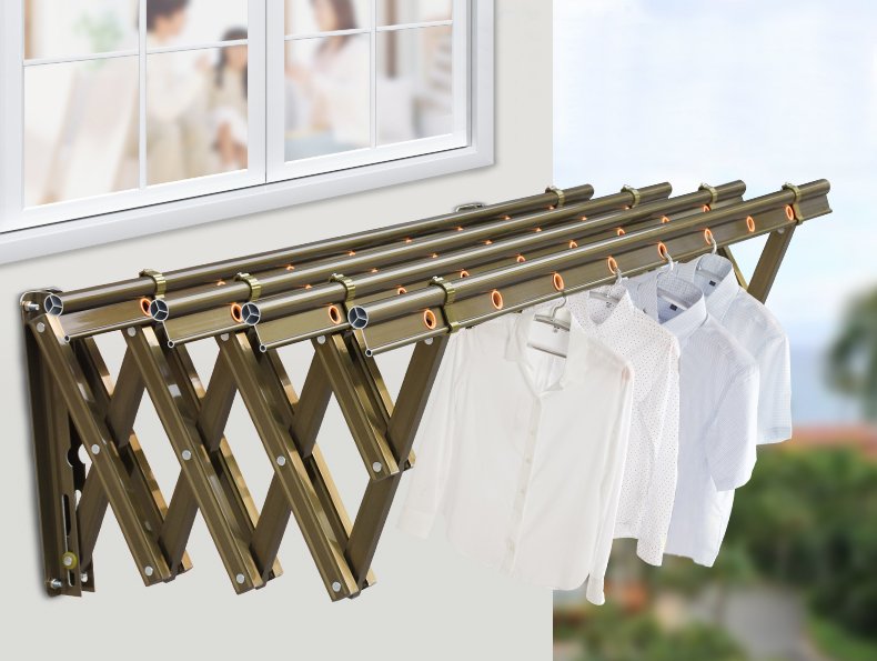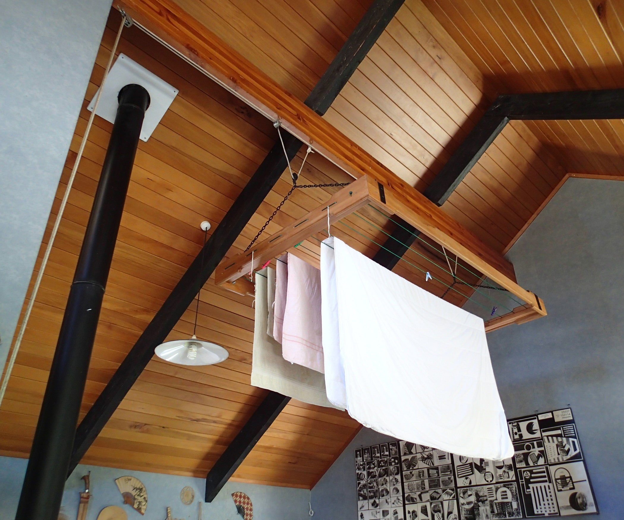 Por lo tanto, para colgar cosas, la anfitriona tendrá que apretar (bajar) la secadora. Después de colgar cosas, puede levantar fácilmente la secadora hasta el techo para que la ropa no interfiera con el pasaje.