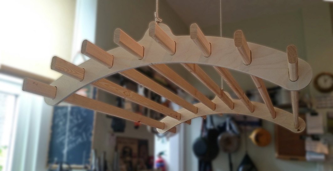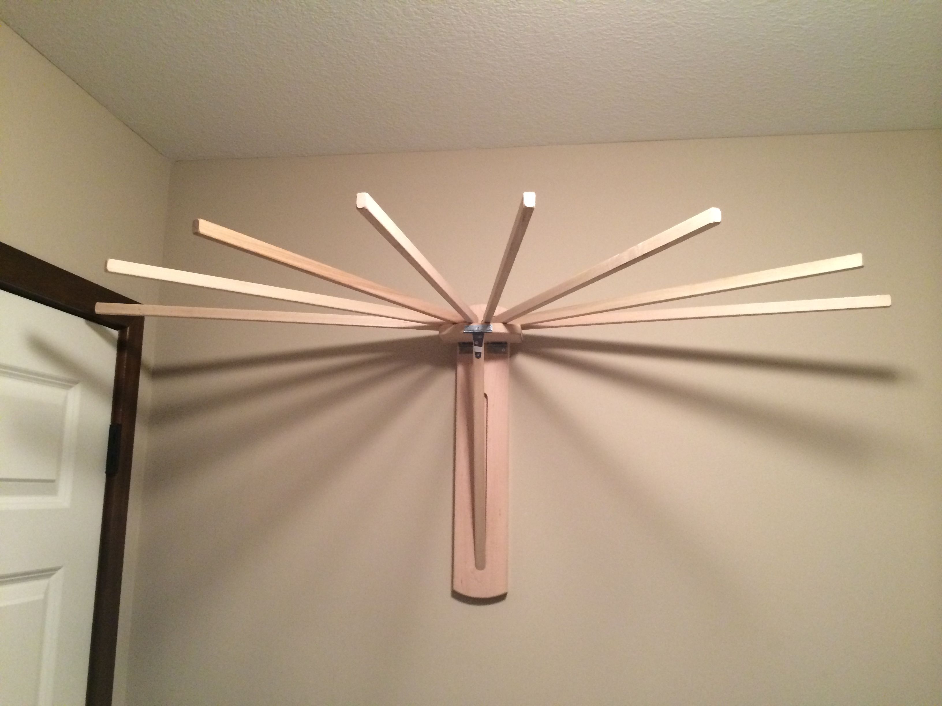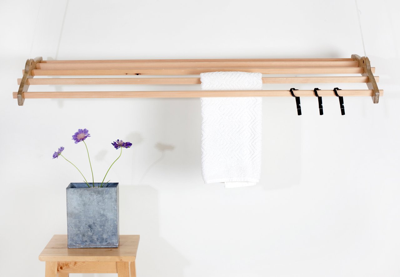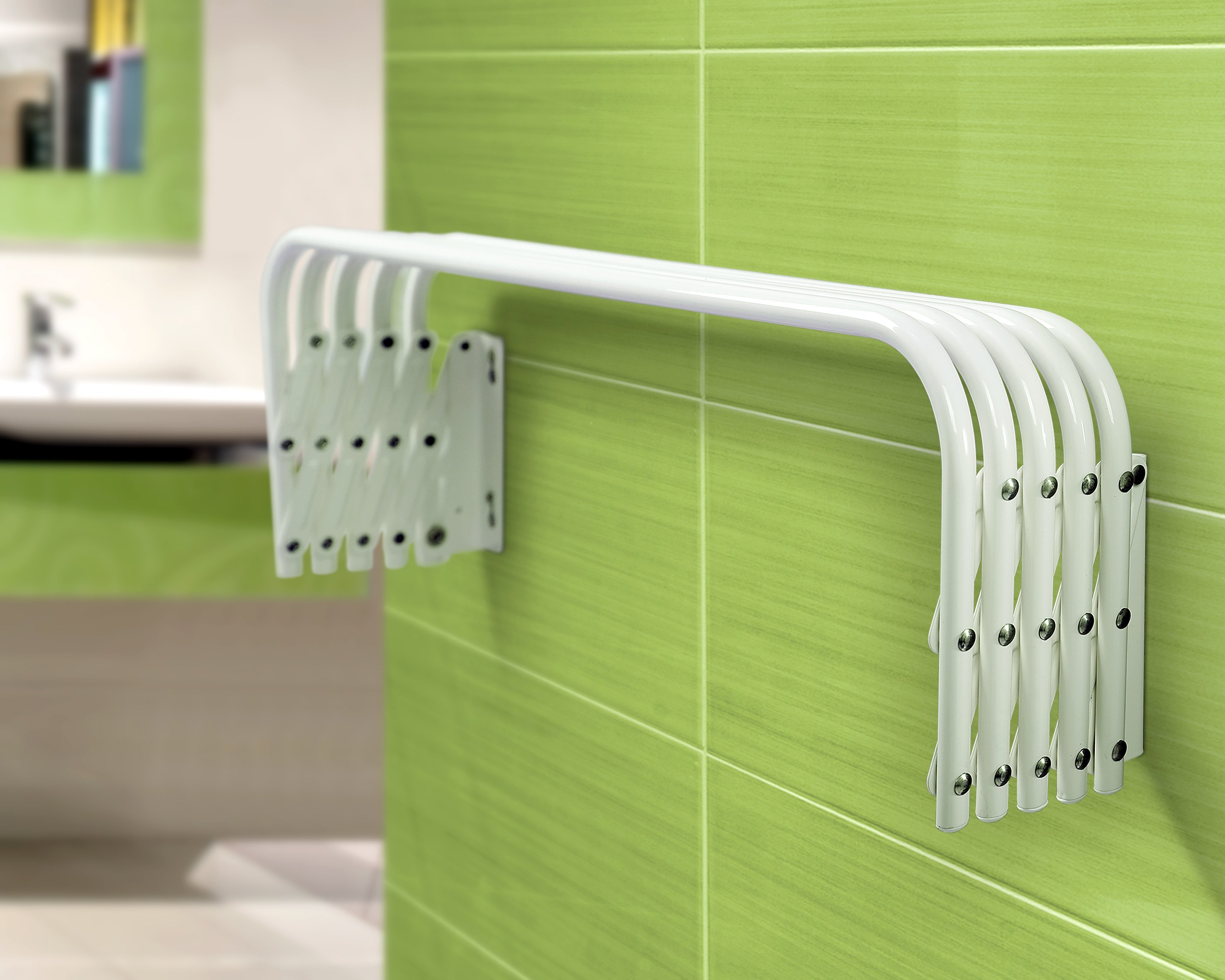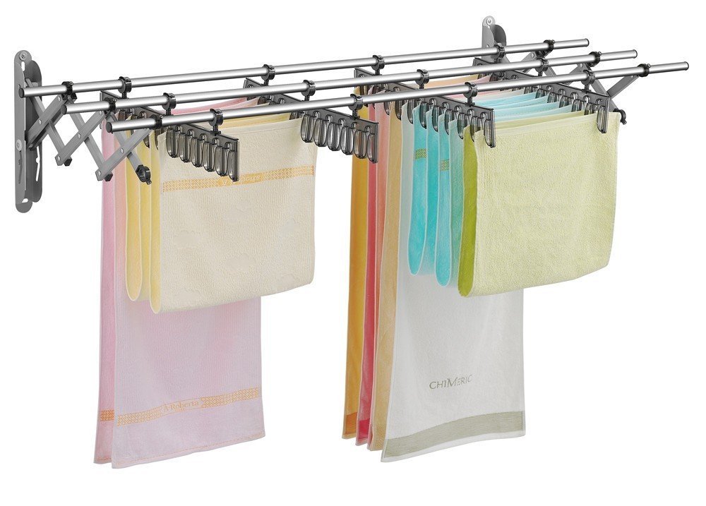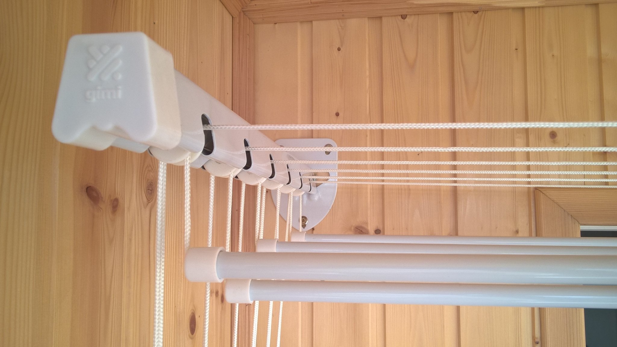 Con varillas regulables por separado. La altura de las barras individuales está regulada por una cuerda separada (fijada en la pared), que le permite colgar cómodamente y al mismo tiempo secarlas adecuadamente.