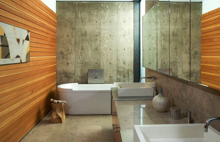 Los tonos cálidos de cualquier tipo de madera suavizan el rigor excesivo del hormigón. La exitosa combinación de superficies grises sin procesar con suaves tonos de madera hace que la habitación sea elegante, acogedora y con un ambiente cálido. Los grandes espejos, el vidrio en combinación con superficies de concreto y detalles metálicos brillantes son un factor determinante en el diseño interior moderno. Las ventanas grandes son muy adecuadas para este diseño. Las plantas verdes crean un contraste espectacular, se suman a la sala de la vida y la frescura natural. Para hacer esto, puede adquirir imitaciones de alta calidad de plantas vivas para crear el efecto deseado.