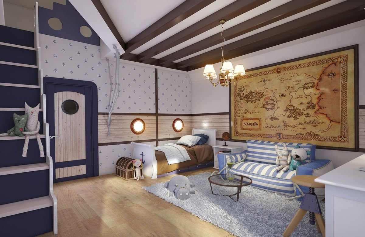 Tema de la navegación. Tal interior es adecuado para un niño en edad escolar. Los símbolos marítimos son apropiados aquí: ojo de buey, timón, ancla, banderas de señalización.Una cama con forma de barco se convertirá no solo en un lugar para dormir, sino también en un excelente campo de juego;