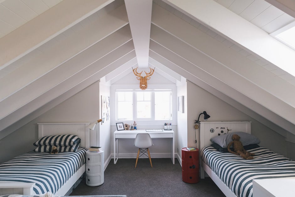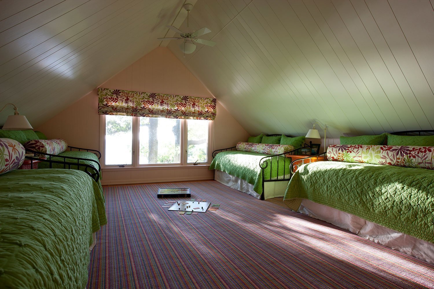 El ático para dos hermanas se convertirá en un verdadero reino para pequeñas princesas. Junto a la ventana se coloca un amplio lugar de trabajo, las camas están orientadas hacia la pared. La habitación está decorada con almohadas brillantes y (o) alfombras. Si el espacio lo permite, es posible colocar las camas perpendiculares entre sí.