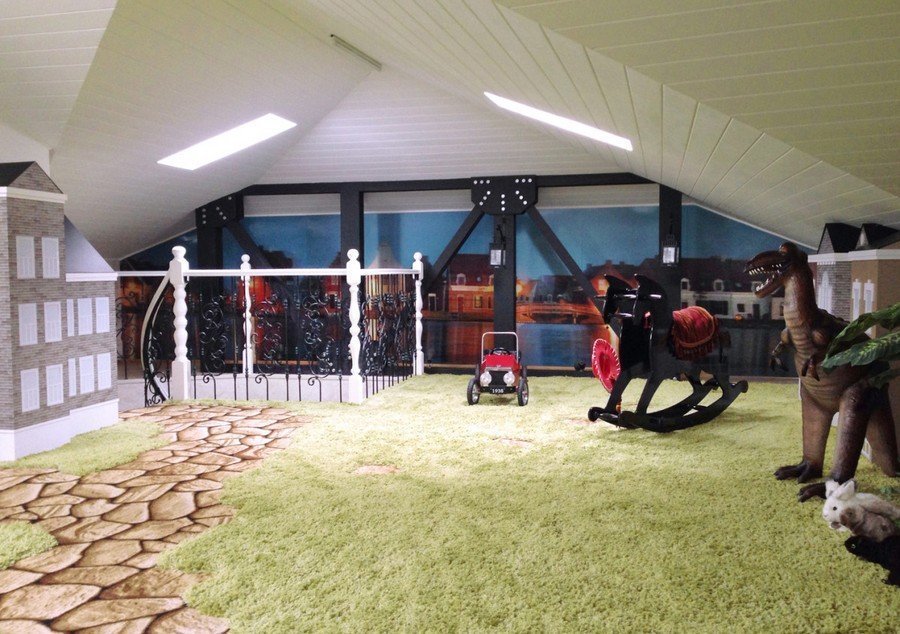 Zona de juegos. El requisito principal es la ausencia de esquinas afiladas y el máximo espacio libre. Puede resaltar el área para juegos en el ático con una alfombra o alfombra en el piso, así como papel tapiz brillante.