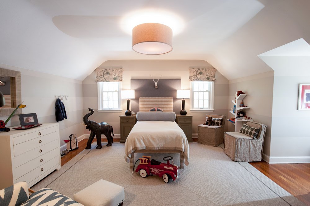 Dimensiones de la sala. Para un ático espacioso, la abundancia de accesorios no será superflua, y para una pequeña guardería, es apropiado un minimalismo acogedor;