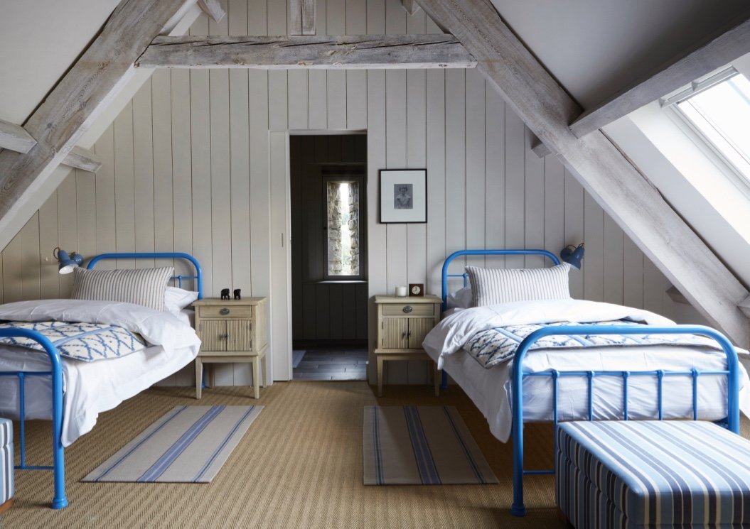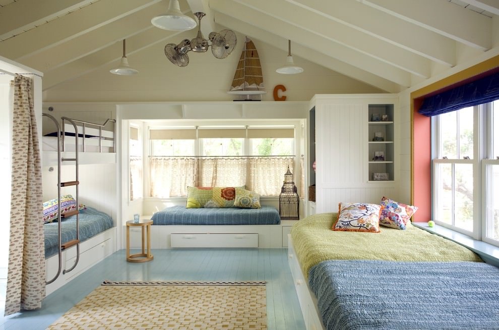 Cabaña junto al mar. Esta opción es más adecuada para niñas. Los colores claros aumentarán visualmente incluso una pequeña habitación en el ático. Textiles naturales, ligeros como si muebles quemados al sol decoraran un vivero;