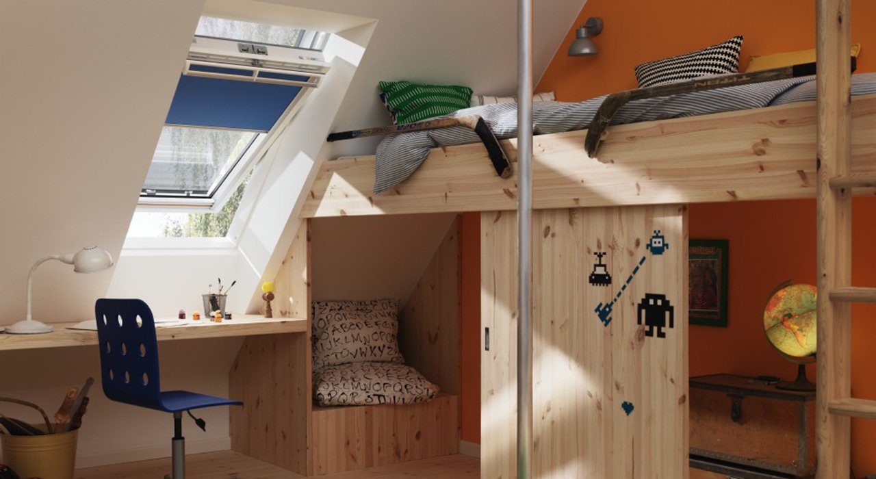 Muebles con geometría simple, de madera maciza. Quizás un barniz que cubra con la preservación de una textura de madera natural o el uso de colores claros. Tapicería de cuero o textil natural (lino o algodón). Se ve bien en el interior escandinavo y las camas con respaldo de metal. Los escandinavos son personas prácticas, por lo tanto, los modelos de transformadores que "crecen" con los niños son bienvenidos. Otro elemento de estilo son los estantes abiertos y los estantes para almacenar juguetes, accesorios y libros. Si el ático es lo suficientemente espacioso, puede proporcionar un lugar debajo de la "cabaña" para juegos. Las ventanas se ven bien enrolladas, cortinas corrugadas o persianas. Para almacenar juguetes, puede adaptar cestas hechas de enredaderas naturales, cajas de textiles y cartón, cofres de madera estilizados "antiguos".