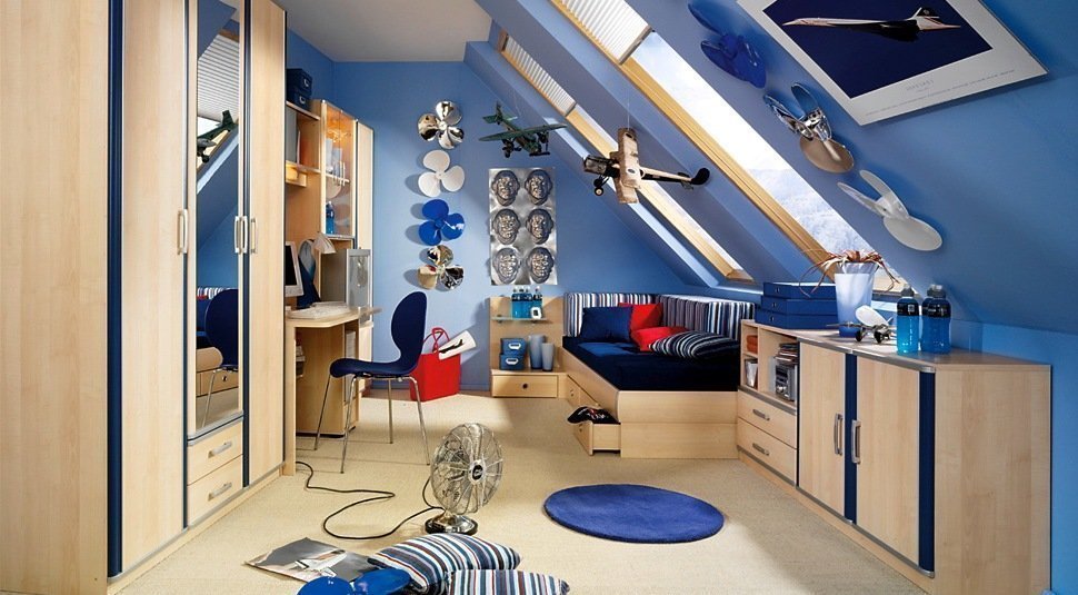 Las preferencias de los niños son algo diferentes de los pasatiempos de las niñas. Son más activos e inquietos, por lo que los muebles deben colocarse para que los "hermanos ladrones" tengan más espacio para los juegos. Mientras que los tonos rosa y beige prevalecen en la habitación de las niñas, en el ático del niño predominan los tonos de verde, azul y azul. Estos mismos colores, solo saturados, se usan para crear acentos. Si los hermanos tienen pasatiempos diferentes, puedes ponerle color a la habitación y usar tus accesorios favoritos.
