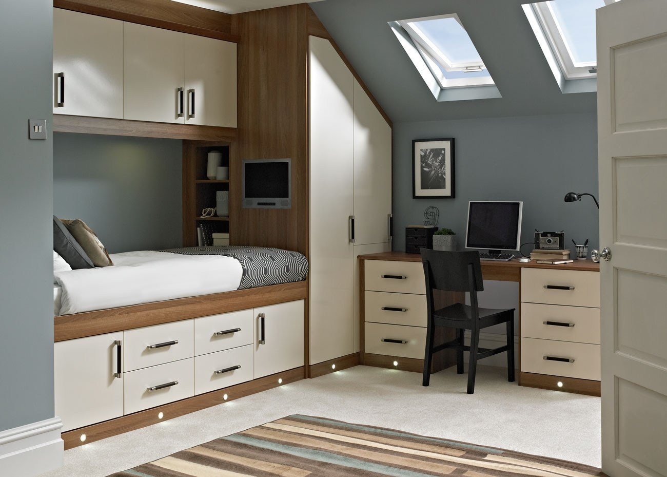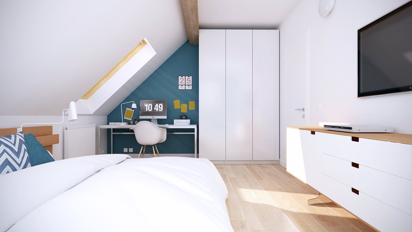 Como regla general, el ático es pequeño, y debe proceder de cuánto "sq. m "a su disposición. Las paredes inclinadas crean una complejidad adicional. Colocar muebles grandes no es fácil. Por lo tanto, para el ático, los muebles de gabinete compactos son más preferibles (la parte superior se puede biselar). La solución espacial específica depende de la configuración y el área de la habitación.Por ejemplo, si el ático es pequeño pero alto, es apropiada una cama en dos niveles con una litera en la parte superior y un escritorio en el "piso" inferior. A veces, este diseño multifuncional incluye un armario para niños.