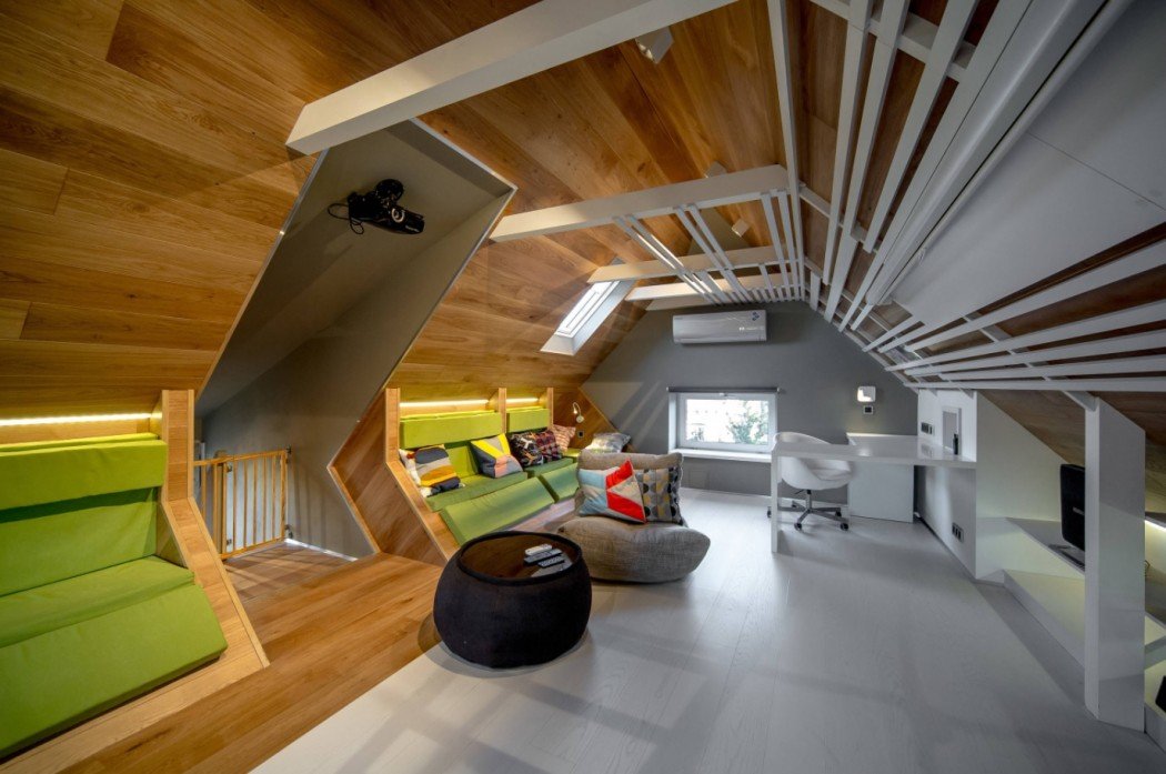 Las fantasías más interesantes se reflejan en la guardería. Aquí pueden vivir héroes de juegos favoritos, libros y dibujos animados. En qué se convertirá el ático: una habitación moderna de alta tecnología, una casa rústica, el castillo de la buena hechicera o la cubierta de un velero de alta velocidad, todo depende de usted y su imaginación de diseño.