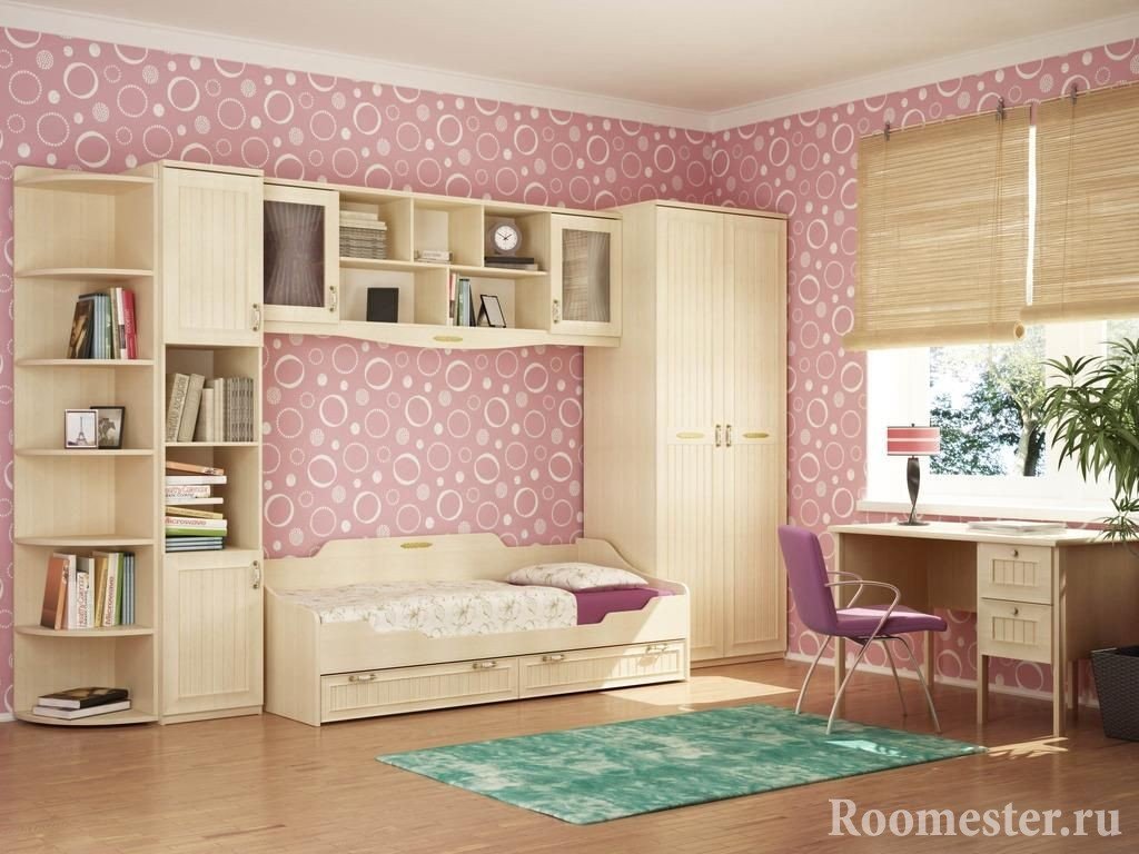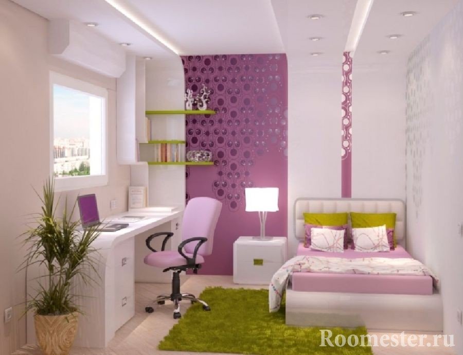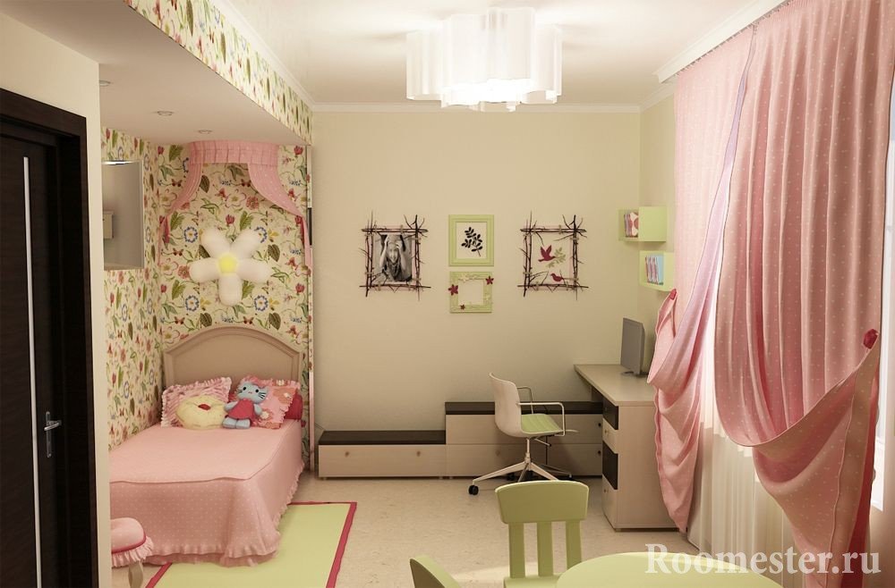 La habitación para la niña es casi una casa llena, debe haber todo lo que necesita. Por lo tanto, se debe prestar especial atención a la zonificación de la habitación, para dividir condicionalmente el espacio con muebles o particiones. Deben asignarse al menos 3 espacios principales, el primero de los cuales está destinado al trabajo, el segundo es un área para dormir y el tercero es para el ocio y los juegos.Si la niña ya usa maquillaje, necesitará un tocador. Las adolescentes requieren un armario en la habitación.