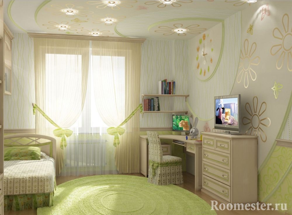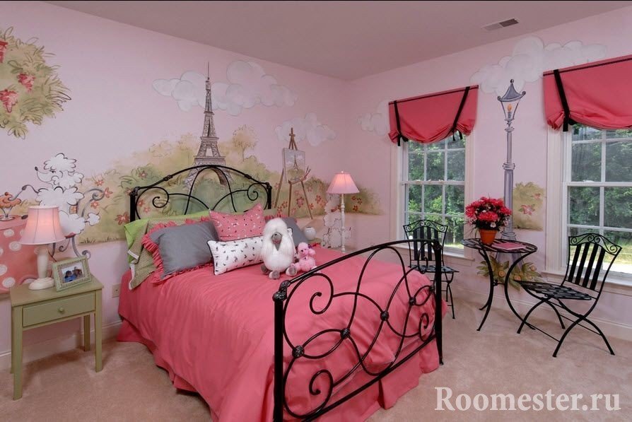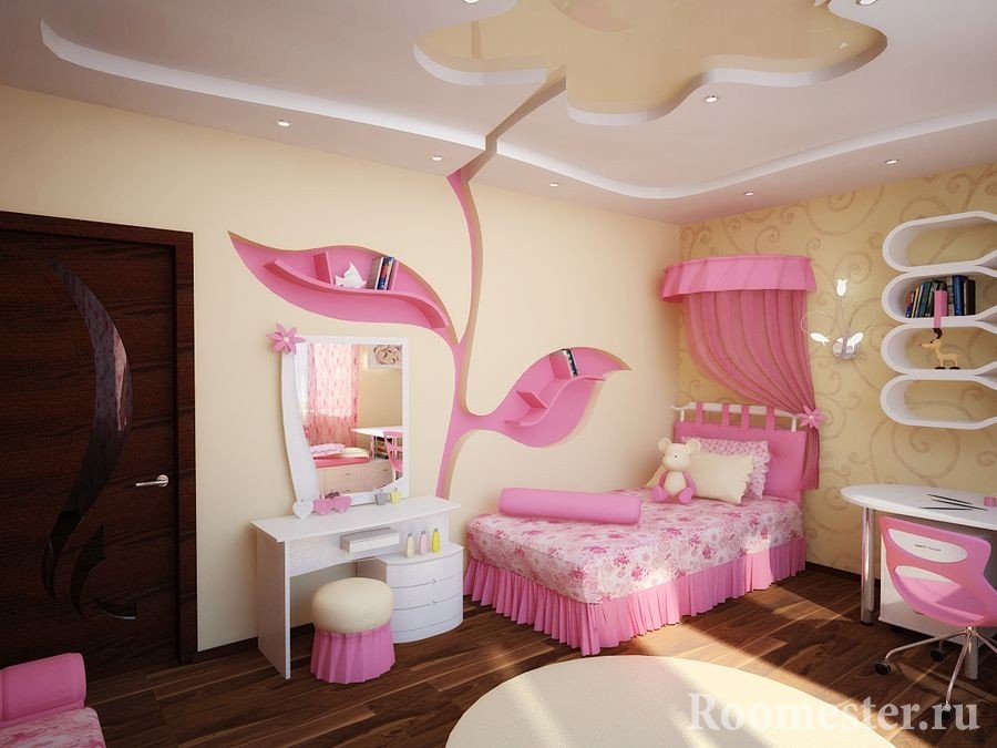 El interior debe ser conmovedor, elegante, correspondiente a una mentalidad completamente diferente de las niñas en comparación con los niños. Les gustarán hermosas composiciones, que incluyen flores, corazones, lazos, estrellas y otros elementos decorativos.
