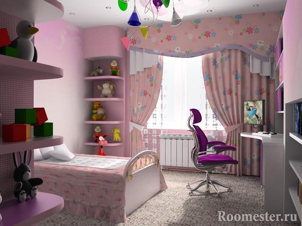 El diseño de una habitación infantil para una niña de esta edad debería contribuir al deseo de conocer el mundo, mostrar amor por la creatividad, aprender algo nuevo. Algunos elementos que estaban presentes en el diseño de la habitación para bebés menores de 3 años deben dejarse atrás. Por ejemplo, no se deshaga de corazones, lazos y otros elementos decorativos. Para el diseño de color, es mejor elegir un tono rosa lila, arena y suave.Debe revivir el interior aburrido con varios elementos brillantes, lo principal es no exagerar.