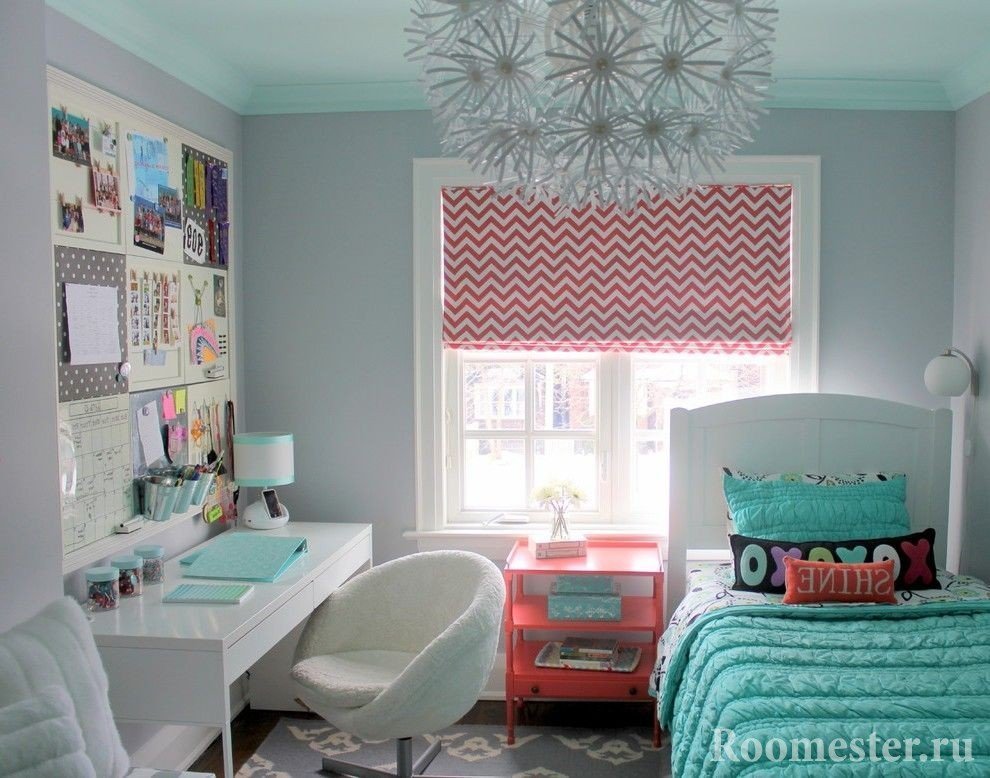 El adolescente preferirá los colores coral, beige, menta o simplemente rojo en 2017 y 2018. Soluciones de color similares pueden enfatizar la zonificación de la habitación. La primera zona debe acomodar un escritorio cómodo con una computadora portátil, necesario para la tarea,artículos de creatividad y una silla. La segunda zona debe proporcionarse para el descanso y el ocio. A las chicas les gusta invitar a amigos a visitar, compartir secretos con ellas, jugar. El área servirá como un lugar para los invitados.