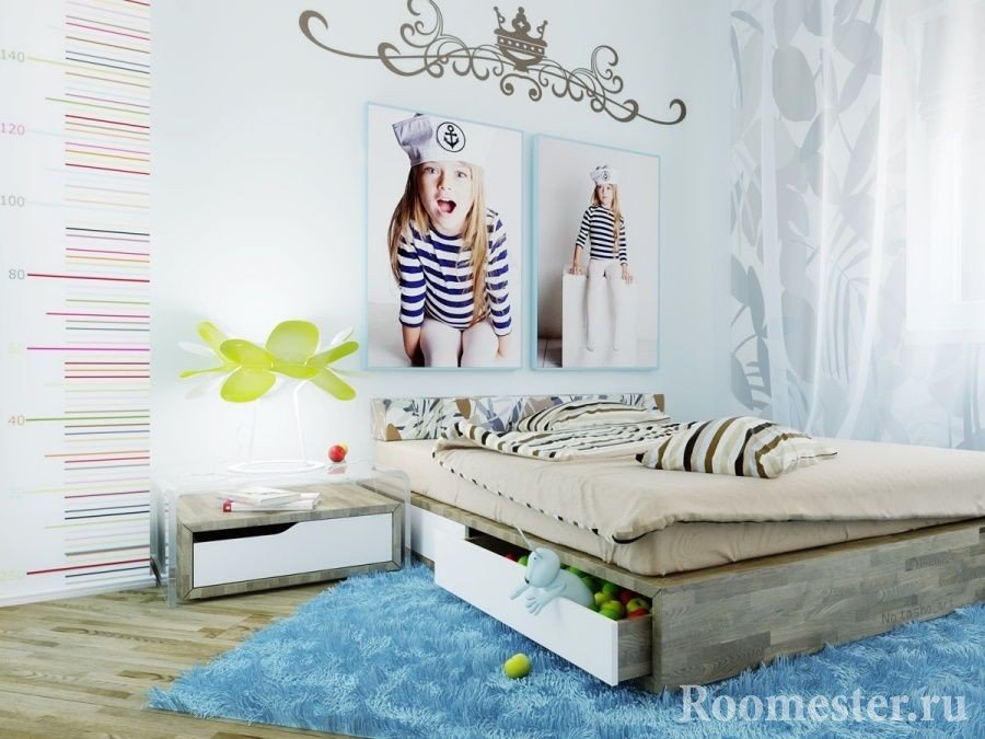 El color azul calma el temperamento, tiene un efecto beneficioso en la capacidad de creatividad de la niña, por ejemplo, en el dibujo. Si se decidió utilizar el tema marino, puede agregar un acuario con peces o el fondo de un reservorio improvisado, será posible enfatizar el estilo.