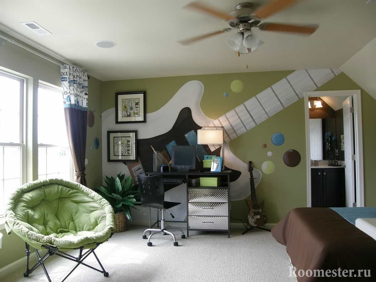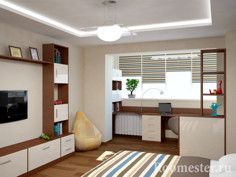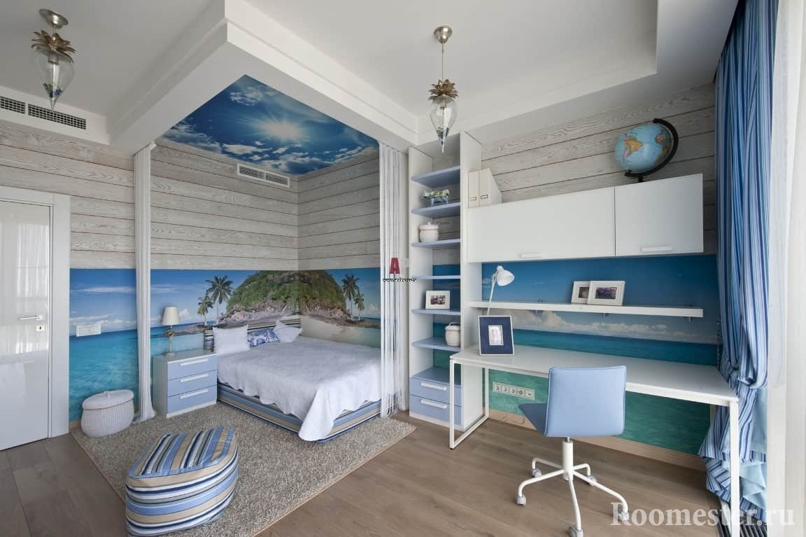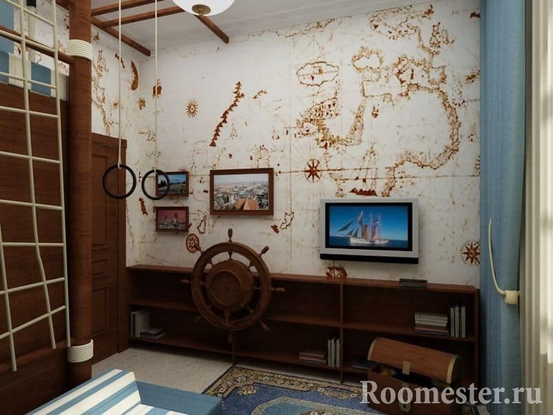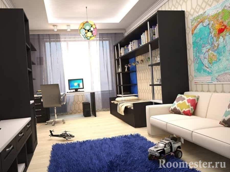 Un diseño similar se pondrá en un estado de ánimo serio, enfatizará el género, sombreará la masculinidad. Es mejor diseñar la guardería de un adolescente con él.La participación del niño apoyará sus gustos, enfatiza la importancia del niño. El mundo interior de un adolescente es muy controvertido, por lo que la posibilidad de una ligera deformación del espacio proporcionará un servicio invaluable. Muebles transformables, decoración universal se convertirá en un asistente serio.