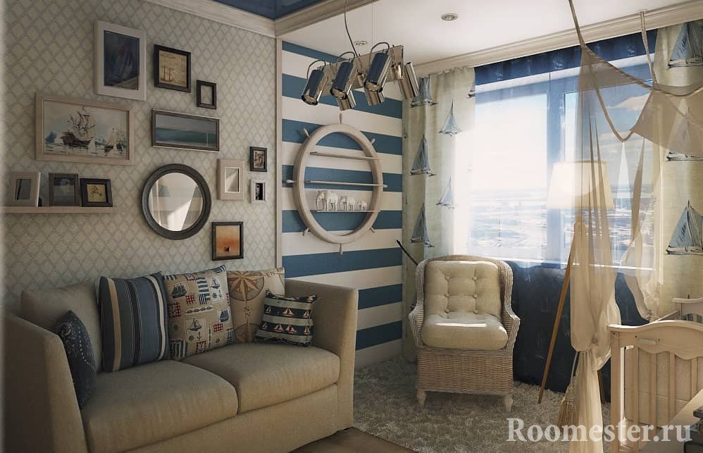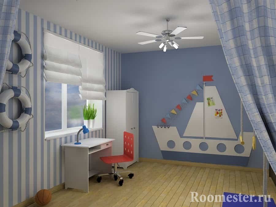 El niño aún muestra interés en los personajes de dibujos animados, pero el interior de la habitación de los niños se realiza mejor sin un énfasis explícito en los personajes. El enfoque temático se convierte en clave. El carácter de la guardería es preferible en sintonía con los intereses del niño. Deportes, equipamiento, naturaleza, viajes son posibles. Los sueños, los sueños de un joven explorador de la realidad circundante ayudan al diseño interior del espacio personal.