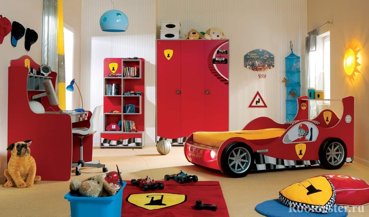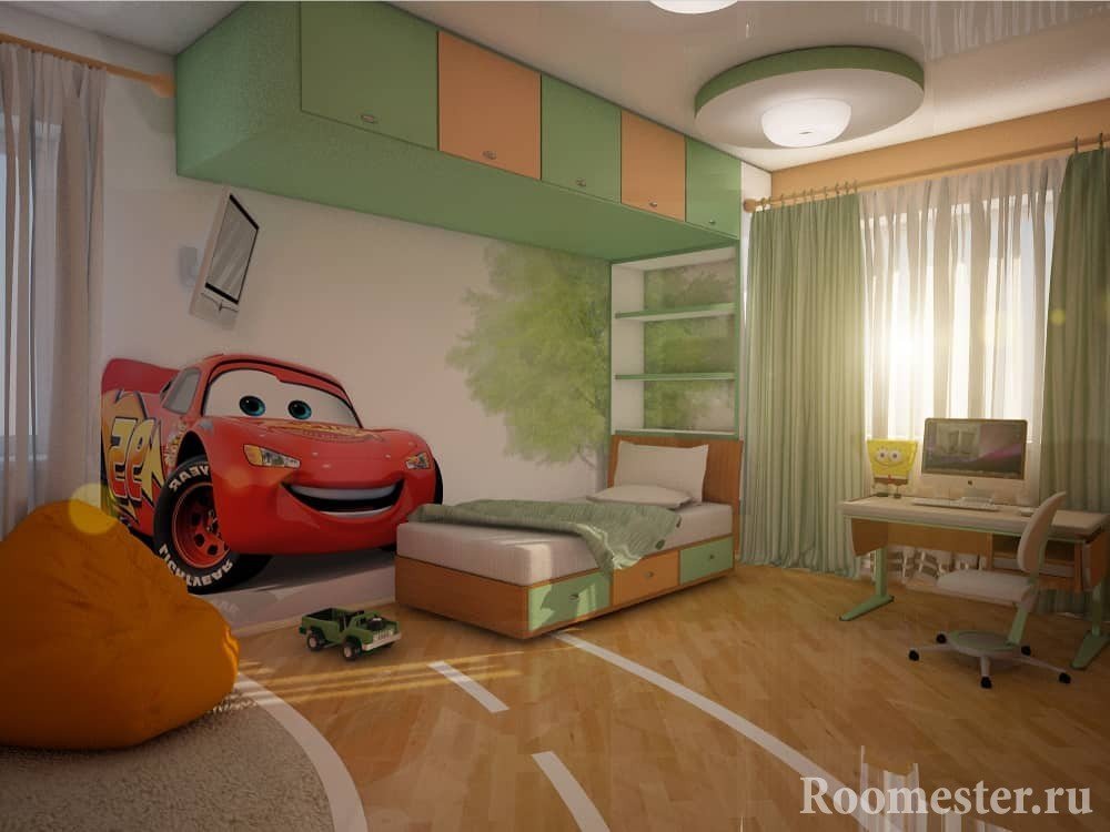 Autos, otros equipos. Muchos hombres de la primera infancia gravitan en todo lo que zumba, ruge, se mueve. El niño estará encantado con la guardería al estilo de la Fórmula 1: una máquina de escribir de cama, calcomanías interiores, orientación adecuada, cortinas "damas". Un niño mayor está impresionado por la dirección cósmica: transbordadores, construcciones del futuro, composiciones futuristas.