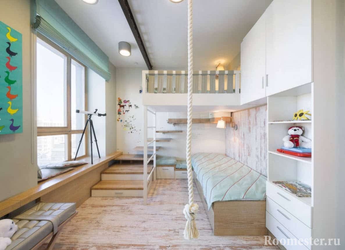 Un niño en edad escolar está interesado en las opciones de camas en el ático. Existe la oportunidad de colocar de forma compacta un escritorio, armario, litera. Se libera mucho espacio, lo cual es importante. Especialmente considerando una opción de área limitada.