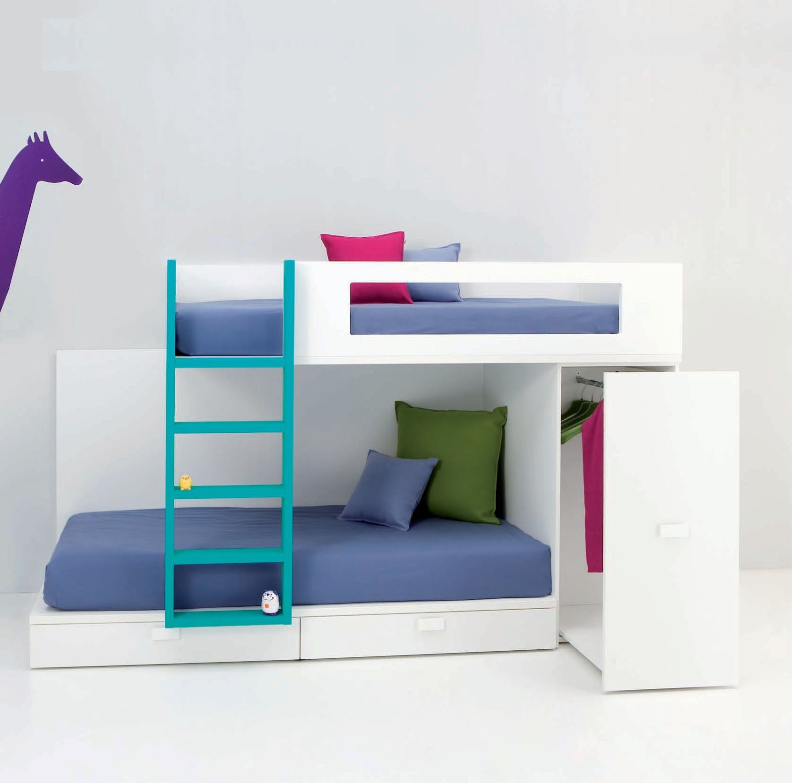 En habitaciones pequeñas puede organizar un podio. En la superficie de la estructura, coloque el área de dormir y de trabajo para un niño y esconda la segunda cama debajo. Es más correcto que un alumno se siente arriba, allí, la luz de una ventana caerá sobre su escritorio. Un lugar para los juegos de un hermano o hermana menor está mejor ubicado en el nivel inferior.