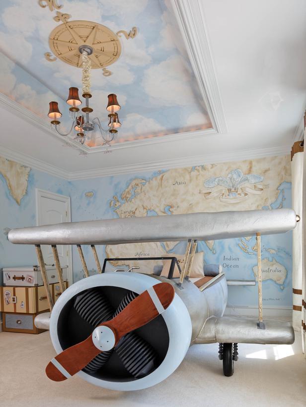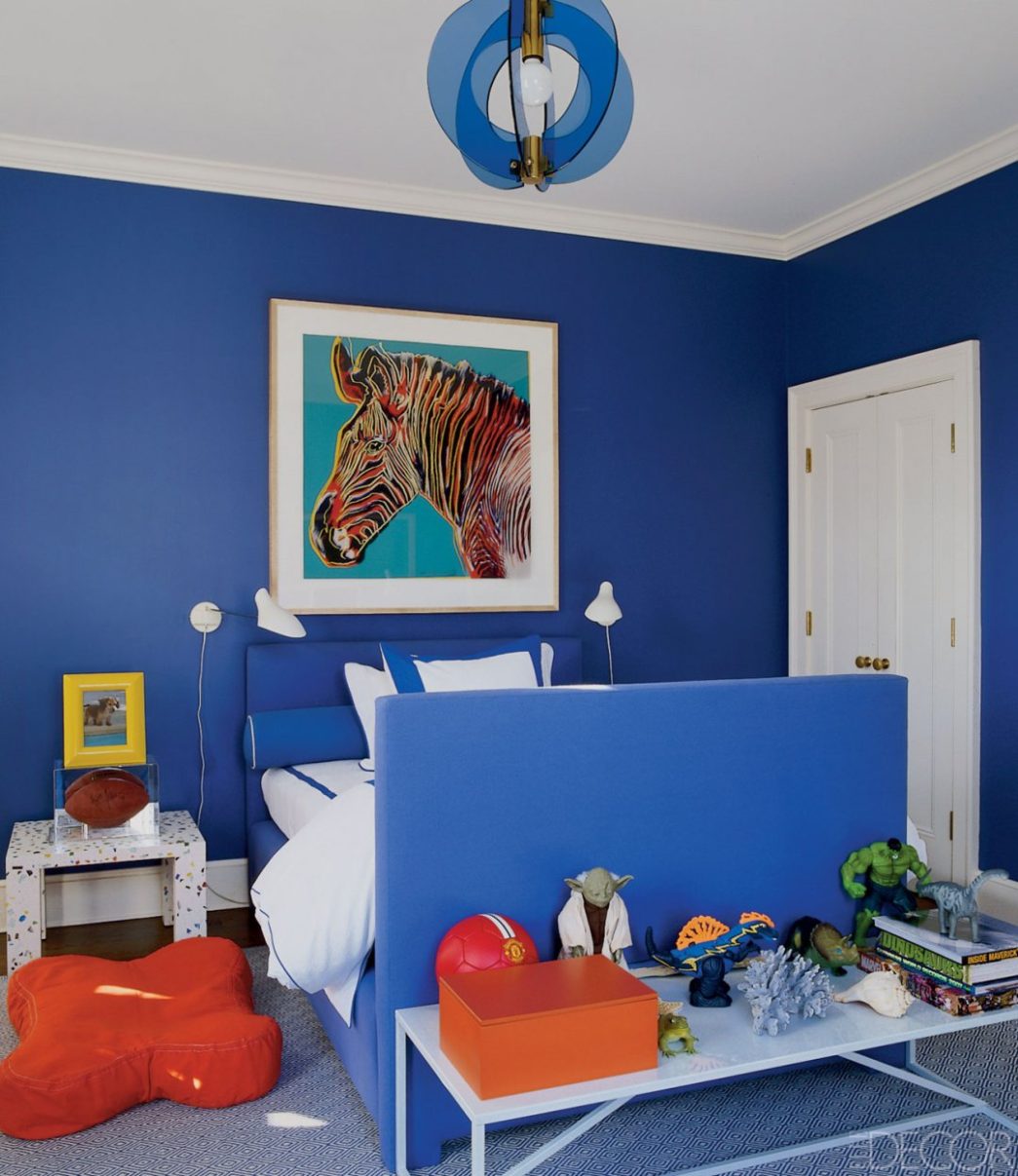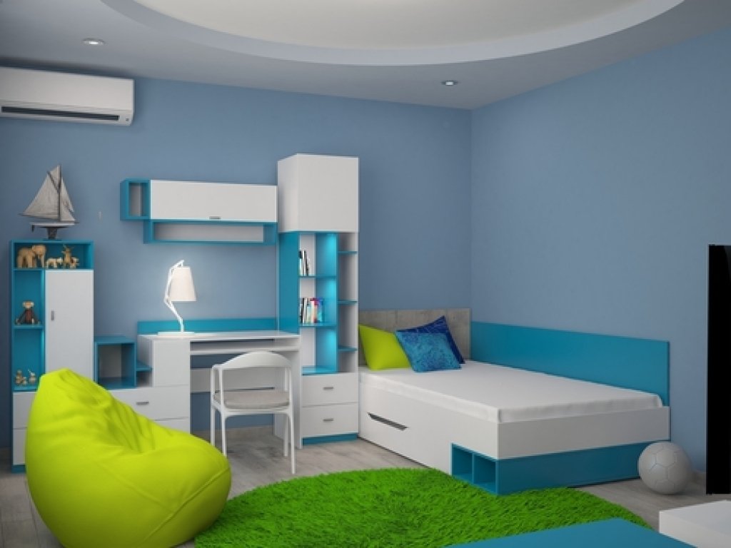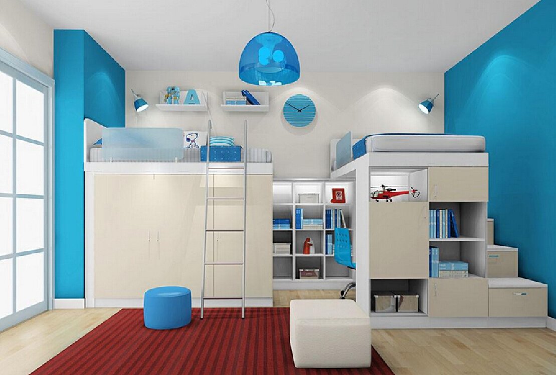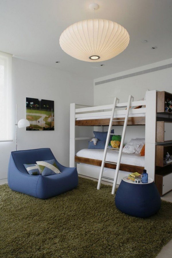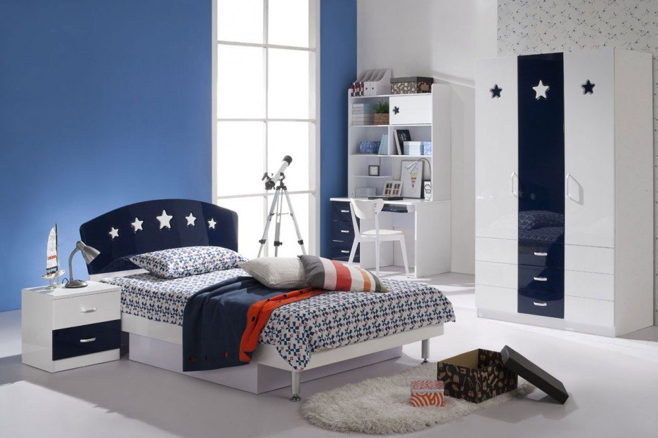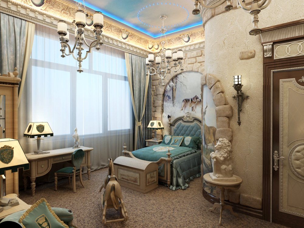 Cualquier color y estilo son aceptables, excepto francamente juvenil: rosa, lila. En la habitación de un niño, es mejor abstenerse de muchos muebles. Los juegos activos requieren espacio libre y seguro. Candelabros, estantes colgantes: todo lo que se puede traer aquí es mejor excluir del interior en la etapa de diseño. Será más apropiado aquí para un rincón deportivo y muebles temáticos: una cama en forma de automóvil o yate.