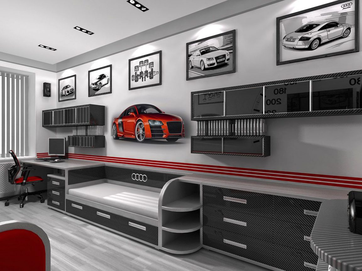 Americano: funcionalidad, simplicidad y conveniencia. Una mezcla de diferentes estilos, una combinación de elementos tradicionales y modernos es aceptable. La cama se encuentra en el centro, armarios y bastidores, a lo largo de las paredes. En las paredes hay carteles brillantes y fotografías en las que se rastrean los pasatiempos del niño: historias de dibujos animados, músicos y actores favoritos, temas de deportes, tecnología;