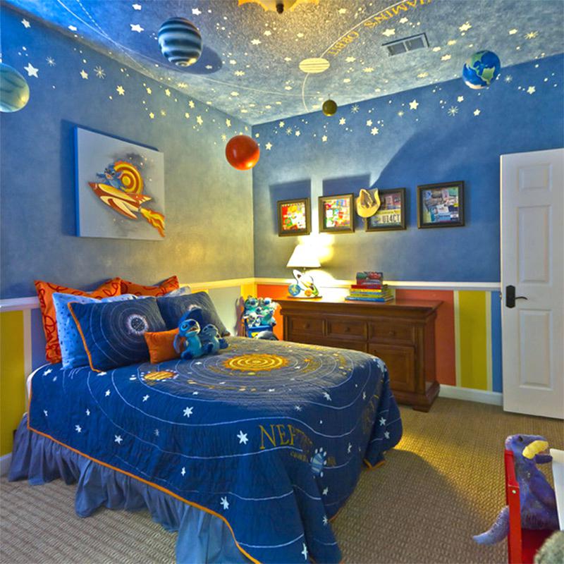 Hay muchas opciones para decorar una habitación infantil. Pegatinas de vinilo, marcos de fotos, carteles harán que el interior sea colorido y único. Si el niño tiene miedo de quedarse dormido en la oscuridad, las pegatinas luminosas o la luz nocturna del cielo estrellado vendrán al rescate. No nos olvidemos de una decoración útil en desarrollo: mapas: cielo geográfico y estrellado, relojes, calendarios, alfabetos, tableros magnéticos, estadiómetros.Cuando juegan, los niños aprenden a determinar el tiempo, trabajan con una escala de medición, recuerdan los nombres de países y ciudades, aprenden idiomas. La decoración de bricolaje se ve genial. Seleccione una estantería o estantería y coloque manualidades, dibujos y aplicaciones de su bebé allí.