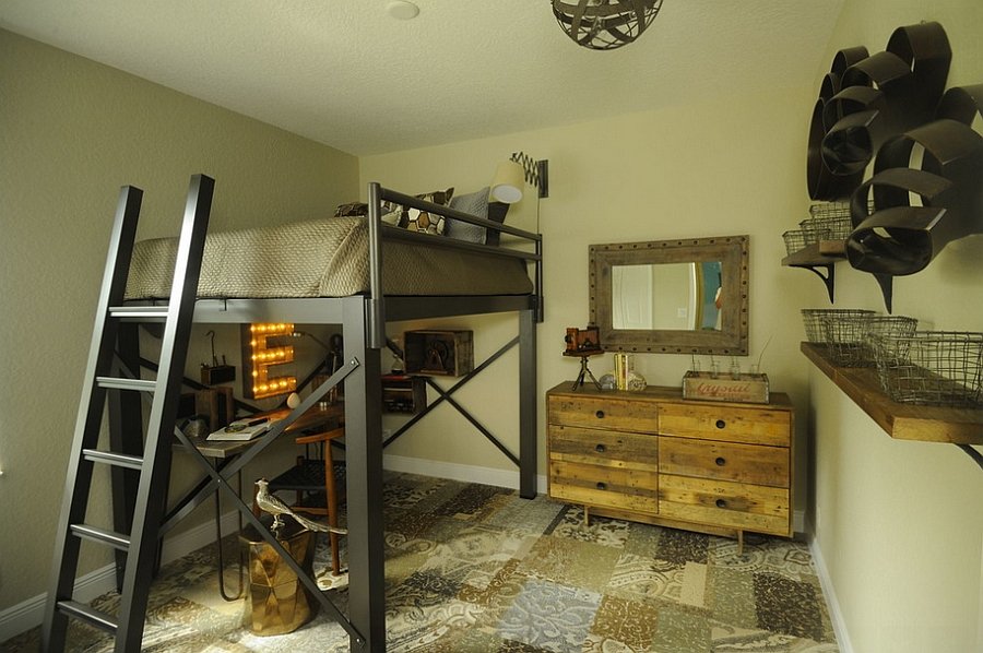 Loft es una gran opción para la habitación de un adolescente. Característica: paredes de ladrillo u hormigón con inscripciones pegadizas, muebles sencillos y groseros, vigas de madera en el techo y acentos inesperados en forma de instrumentos musicales, estatuas clásicas o espejos barrocos. Las luminarias industriales o los sistemas de riel con mecanismos rotativos son apropiados aquí. Los accesorios de cromo brillante y las innovaciones técnicas coexisten con los objetos, como si se encontraran en un vertedero;