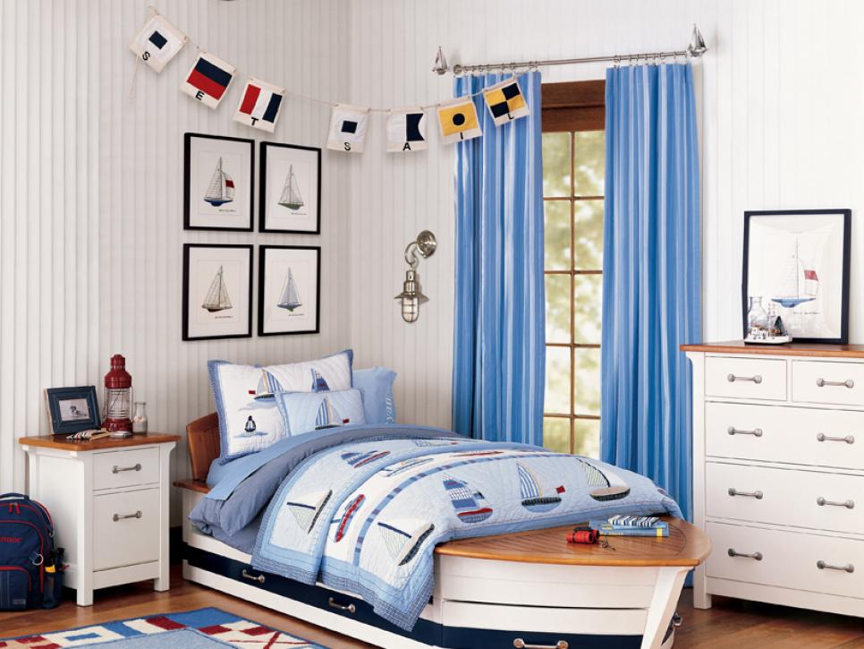 marino: una paleta azul-azul, imágenes de barcos o mapas antiguos, velas en la cabeza. Otra opción es convertir la habitación en un barco pirata con cofres de madera, un timón, equipo y muchos artículos necesarios para un verdadero "lobo marino".