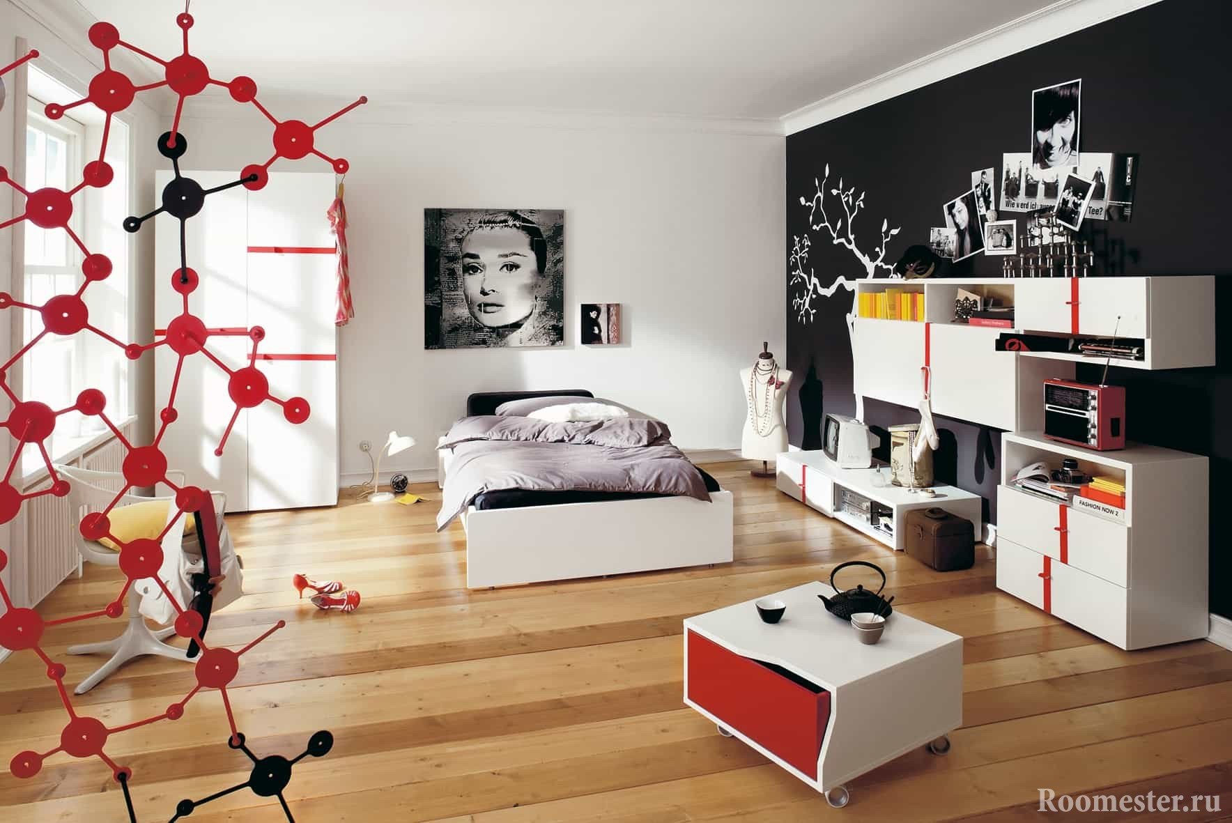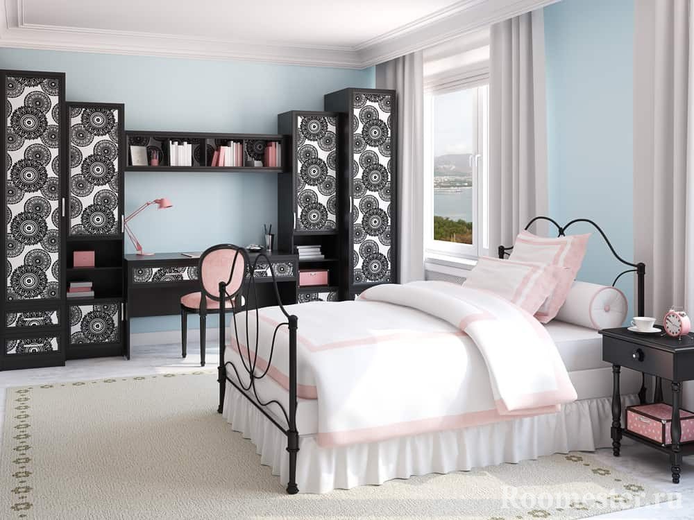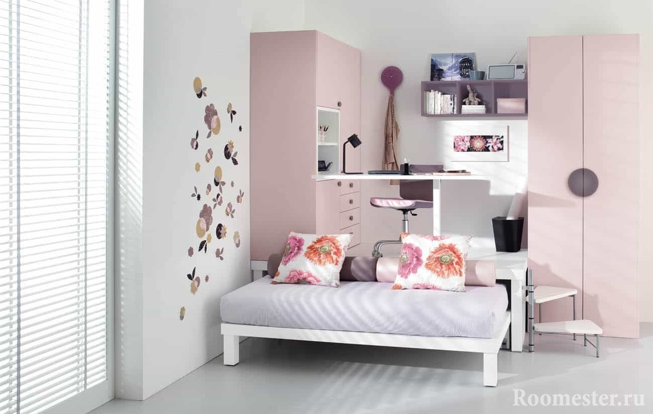 El diseño de una habitación para una niña implica el deseo de un adolescente de usar calcomanías decorativas o carteles de sus personajes favoritos en las puertas del gabinete.