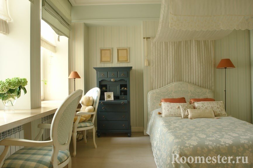 Si una niña puede ser llamada una persona soñadora, entonces este estilo exquisito enfatizará su sofisticación y feminidad.La superficie de las paredes está decorada exclusivamente con tonos claros para contrastar con imágenes en blanco y negro de la capital de Francia. Puede ser carteles, carteles o papel tapiz fotográfico. Luego, el diseño minimalista de la habitación se llena de elegantes accesorios con acento francés. Un conjunto de muebles tallados con espejo se verá genial.