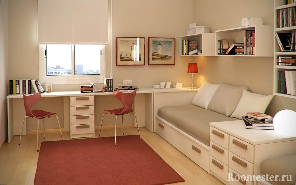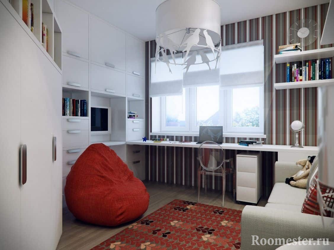 A la edad de 15 años, los niños a menudo forman parte de "pandillas" adolescentes, comunidades de interés, por lo que es aconsejable prever la posibilidad de reuniones amistosas. Para hacer esto, el diseño de la habitación del adolescente se puede decorar con pufs suaves o almohadas de colores, que ocupan mucho menos espacio que las sillas.