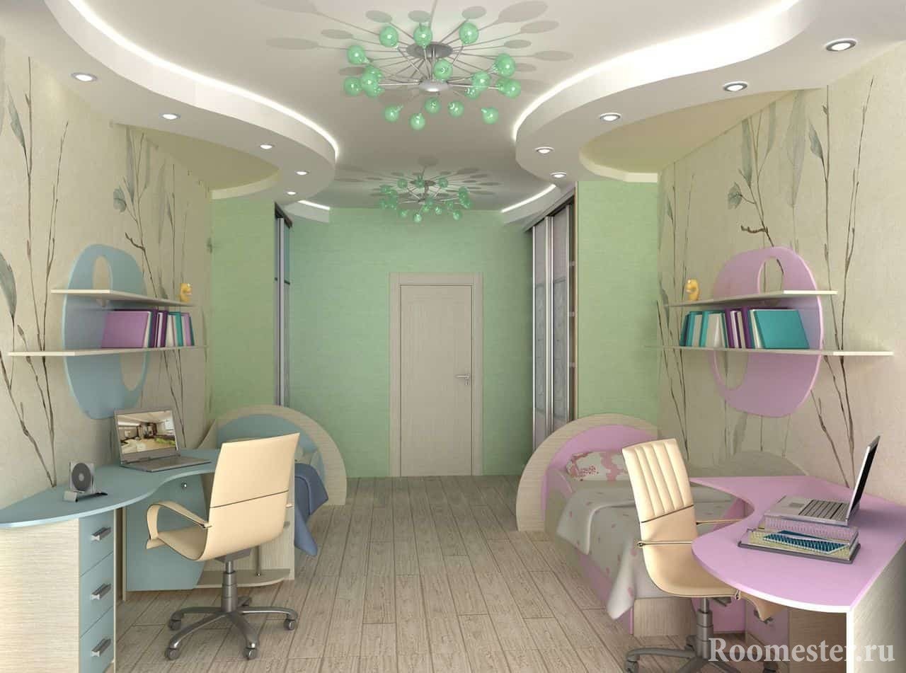 La generación más joven necesita mucha luz natural. Es deseable hacer un punto de iluminación artificial, para cada área funcional. Por lo tanto, delimitan adicionalmente el espacio. Para las niñas, la opción con una hermosa lámpara de araña con motivos florales es más adecuada.
