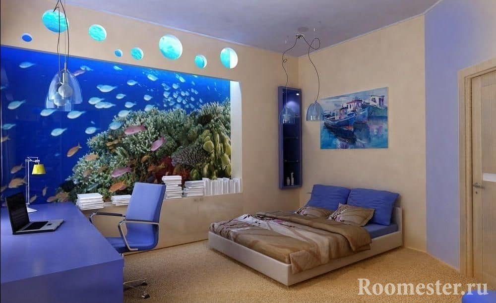 Colores blanco y azul, productos de madera, fornitura de metal: todo debe recordar el mar. Puede organizar las cortinas en forma de velas, y el piso está debajo de la cubierta. Ideal para adolescentes soñadores, desde la infancia, enamorados de la geografía con sus viajes al extranjero.
