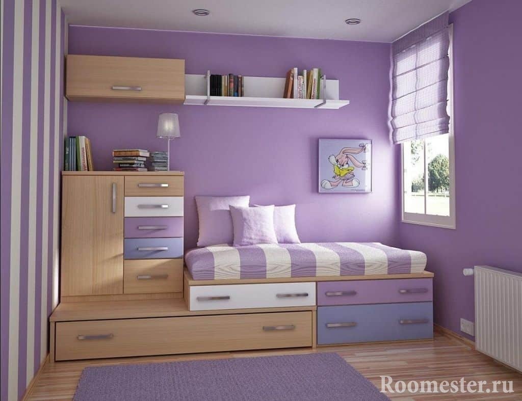 La cama debe ser cómoda y ergonómica, posiblemente con un colchón ortopédico, porque el niño todavía está creciendo. Para las niñas, es adecuada una cama en el podio, con cajones para la ropa. Los sofás transformadores son mejores para no usar en absoluto.