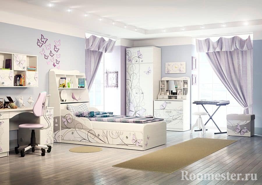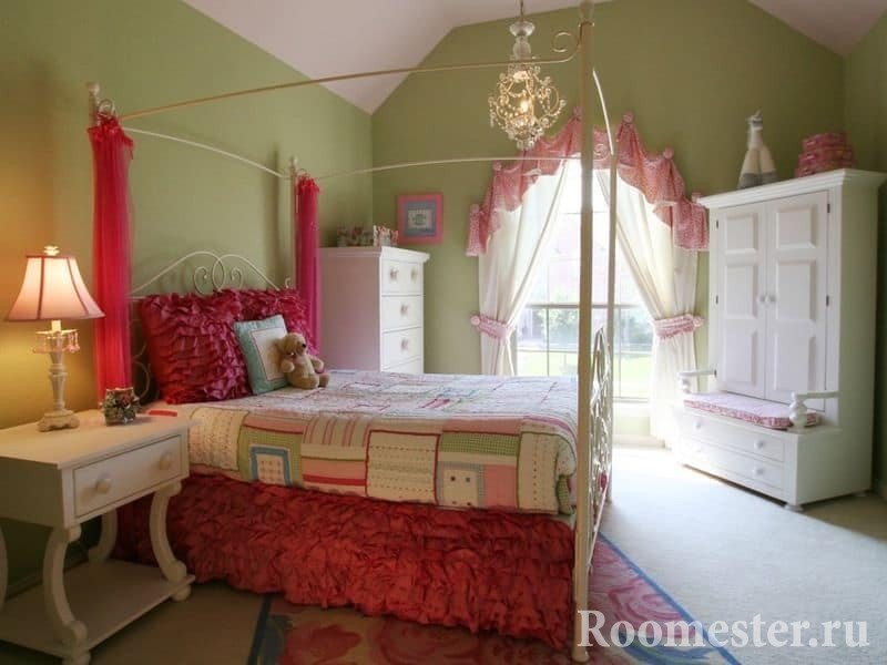 Se considera una de las decisiones más exitosas si el adolescente es una niña. En el marco de este estilo, las habilidades económicas del futuro guardián del hogar pueden manifestarse. Es cierto que los padres deben saber que, además de mantener la simetría, esta decoración requiere la presencia de telas caras y otros artículos de lujo.